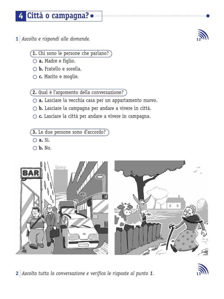 1 Ascolta e rispondi alle domande. 1. Chi sono le persone che parlano? a. Madre e figlio. b. Fratello e sorella. c. Marito e moglie. 2. Qual largomento della conversazione? a. Lasciare la vecchia casa per un appartamento nuovo. b. Lasciare la campagna per andare a vivere in citt. c. Lasciare la citt per andare a vivere in campagna. 3. Le due persone sono daccordo? a. S. b. No.