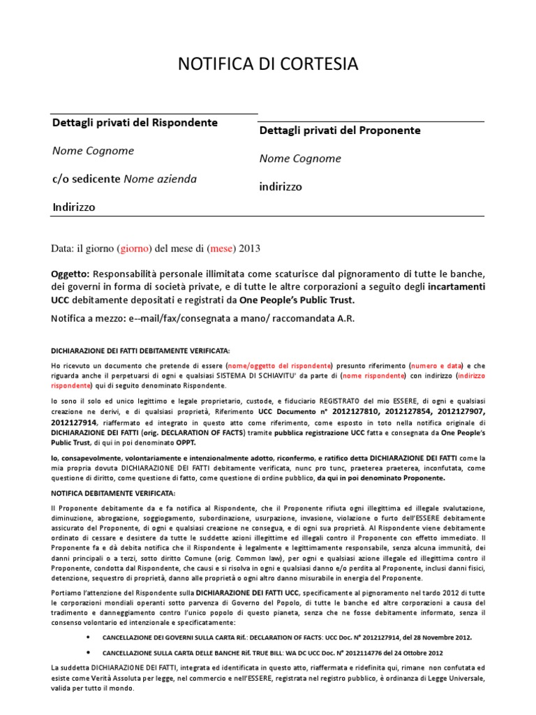 DICHIARAZIONE DEI FATTI DEBITAMENTE VERIFICATA: Ho ricevuto un documento che pretende di essere (nome/oggetto del rispondente) presunto riferimento (numero e data) e che riguarda anche il perpetuarsi di ogni e qualsiasi SISTEMA DI SCHIAVITU' da parte di (nome rispondente) con indirizzo (indirizzo rispondente) qui di seguito denominato Rispondente. Io sono il solo ed unico legittimo e legale proprietario, custode, e fiduciario REGISTRATO del mio ESSERE, di ogni e qualsiasi creazione ne derivi, e di qualsiasi propriet, Riferimento UCC Documento n 2012127810, 2012127854, 2012127907, 2012127914, riaffermato ed integrato in questo atto come riferimento, come esposto in toto nella notifica originale di DICHIARAZIONE DEI FATTI (orig. DECLARATION OF FACTS) tramite pubblica registrazione UCC fatta e consegnata da One Peoples Public Trust, di qui in poi denominato OPPT. Io, consapevolmente, volontariamente e intenzionalmente adotto, riconfermo, e ratifico detta DICHIARAZIONE DEI FATTI come la mia propria dovuta DICHIARAZIONE DEI FATTI debitamente verificata, nunc pro tunc, praeterea praeterea, inconfutata, come questione di diritto, come questione di fatto, come questione di ordine pubblico, da qui in poi denominato Proponente. NOTIFICA DEBITAMENTE VERIFICATA: Il Proponente debitamente da e fa notifica al Rispondente, che il Proponente rifiuta ogni illegittima ed illegale svalutazione, diminuzione, abrogazione, soggiogamento, subordinazione, usurpazione, invasione, violazione o furto dellESSERE debitamente assicurato del Proponente, di ogni e qualsiasi creazione ne consegua, e di ogni sua propriet. Al Rispondente viene debitamente ordinato di cessare e desistere da tutte le suddette azioni illegittime ed illegali contro il Proponente con effetto immediato. Il Proponente fa e d debita notifica che il Rispondente legalmente e legittimamente responsabile, senza alcuna immunit, dei danni principali o a terzi, sotto diritto Comune (orig. Common law), per ogni e qualsiasi azione illegale ed illegittima contro il Proponente, condotta dal Rispondente, che causi e si risolva in ogni e qualsiasi danno e/o perdita al Proponente, inclusi danni fisici, detenzione, sequestro di propriet, danno alle propriet o ogni altro danno misurabile in energia del Proponente. Portiamo lattenzione del Rispondente sulla DICHIARAZIONE DEI FATTI UCC, specificamente al pignoramento nel tardo 2012 di tutte le corporazioni mondiali operanti sotto parvenza di Governo del Popolo, di tutte le banche ed altre corporazioni a causa del tradimento e danneggiamento contro lunico popolo di questo pianeta, senza che ne fosse debitamente informato, senza il consenso volontario ed intenzionale e specificatamente:
