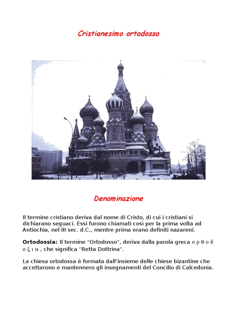 Il termine cristiano deriva dal nome di Cristo, di cui i cristiani si dichiarano seguaci. Essi furono chiamati cos per la prima volta ad Antiochia, nel III sec. d.C., mentre prima erano definiti nazareni. Ortodossia: Il termine "Ortodosso", deriva dalla parola greca , che significa "Retta Dottrina". La chiesa ortodossa formata dallinsieme delle chiese bizantine che accettarono e mantennero gli insegnamenti del Concilio di Calcedonia.