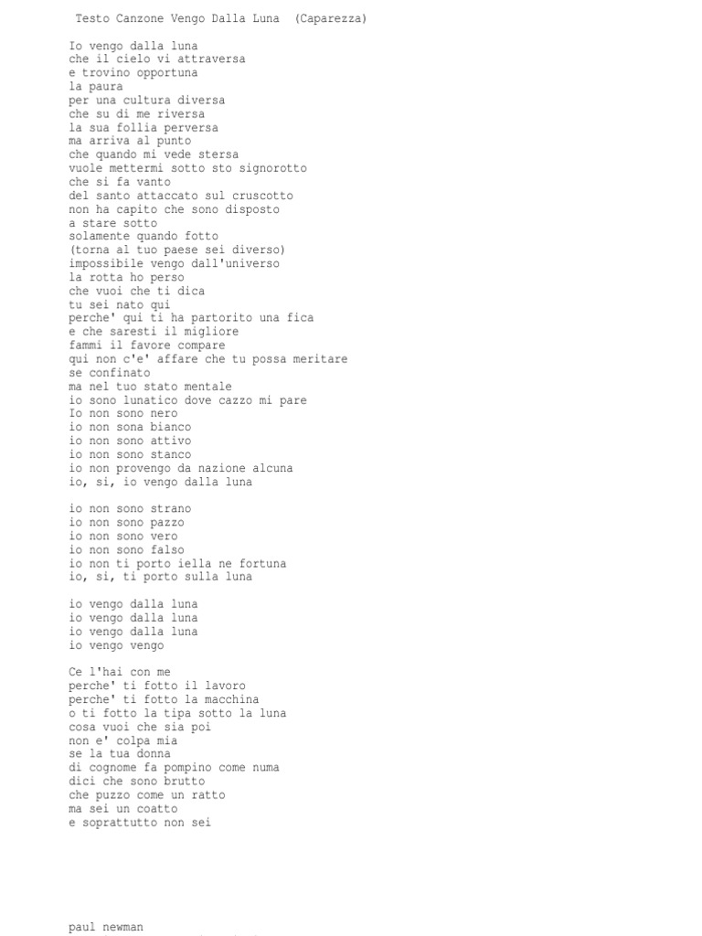 Testo Canzone Vengo Dalla Luna (Caparezza) Io vengo dalla luna che il cielo vi attraversa e trovino opportuna la paura