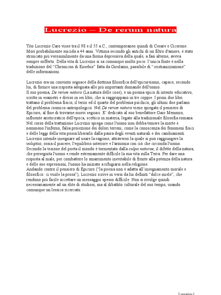 Tito Lucrezio Caro visse tra il 98 e il 55 a.C., contemporaneo quindi di Cesare e Cicerone. Mor probabilmente suicida a 44 anni. Vittima secondo gli antichi di un filtro d'amore, stato stroncato pi verosimilmente da una forma depressiva della quale, a fasi alterne, aveva sempre sofferto. Della vita di Lucrezio si sa comunque molto poco: lunica fonte nella traduzione del Chronicon di Eusebio fatta da Girolamo, passibile di cristianizzazione delle informazioni. Lucrezio era un convinto seguace della dottrina filosofica dell'epicureismo, capace, secondo lui, di fornire una risposta adeguata alle pi importanti domande dell'uomo. Il suo poema, De rerum natura (La natura delle cose), un poema epico di intento educativo, scritto in esametri e diviso in sei libri, che si raggruppano in tre coppie. I primi due libri trattano il problema fisico, il terzo ed il quarto del problema psichico, gli ultimi due parlano del problema cosmico-antropologico. Nel De rerum natura viene spiegato il pensiero di Epicuro, al fine di trovarne nuovi seguaci. E dedicato al suo benefattore Gaio Memmio, influente aristocratico dell'epoca, scettico in materia, legato alla tradizionale filosofia romana. Nel corso della trattazione Lucrezio spiega come l'uomo non debba temere la morte e nemmeno l'inferno, falsa proiezione dei dolori terreni; come la conoscenza dei fenomeni fisici e delle leggi della vita possa liberarlo dalla paura degli eventi naturali e dei cambiamenti. Lucrezio intende insegnare ad usare la ragione, attraverso la quale si pu raggiungere la voluptas, ossia il piacere, l'equilibrio interiore e l'armonia con ci che circonda l'uomo. Secondo la visione del poeta il mondo tormentato dalla culpa naturae, il difetto della natura, che perseguita l'uomo e rende estremamente difficile la sua vita sulla Terra. Per dare una risposta al male, per combattere lo smarrimento inevitabile di fronte alla potenza della natura e delle sue espressioni, l'uomo ha iniziato a rifugiarsi nella religione. Andando contro il pensiero di Epicuro (la poesia non adatta allinsegnamento morale e filosofico: ci vuole la prosa), Lucrezio scrive in versi da lui definiti dolce miele, che rendono pi facile accettare un messaggio spesso difficile. Non si rivolge quindi necessariamente ad un lite di studiosi, ma al dibattito culturale del suo tempo, usando comunque un lessico ricercato.