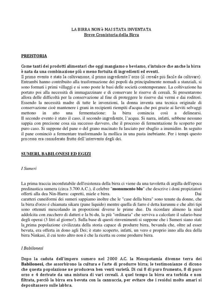 PREISTORIA Come tanti dei prodotti alimentari che oggi mangiamo o beviamo, sintuisce che anche la birra nata da una combinazione pi o meno fortuita di ingredienti ed eventi. Il primo evento stato la coltivazione, il primo ingrediente lorzo (il cereale pi facile da coltivare). Entrambi hanno contribuito alla trasformazione dei popoli da principalmente nomadi a stanziali, si sono formati i primi villaggi e si sono poste le basi delle societ contemporanee. La coltivazione ha portato poi alla necessit di immagazzinare e di conservare le riserve di cereali. Si presentarono allora delle difficolt per la conservazione al fine di proteggere le riserve dai vermi e dai roditori. Essendo la necessit madre di tutte le invenzioni, la donna inventa una tecnica originale di conservazione cio mantenere i grani in recipienti riempiti d'acqua che poi grazie ai lieviti selvaggi mettono in atto una fermentazione: la birra comincia cos a delinearsi. Il secondo evento stato il caso, il secondo ingrediente, lacqua. Si narra, infatti, sebbene nessuno sappia con precisone cosa sia successo davvero, che il processo di fermentazione fu scoperto per puro caso. Si suppone del pane o del grano macinato fu lasciato per sbaglio a inumidire. In seguito il pane cominci a fermentare trasformando la mollica in una pasta inebriante. Per i tempi questo processo era considerato frutto dellintervento degli dei. SUMERI, BABILONESI ED EGIZI I Sumeri La prima traccia inconfutabile dell'esistenza della birra ci viene da una tavoletta di argilla dell'epoca predinastica sumera (circa 3.700 A.C.), il celebre "monumento blu" che descrive i doni propiziatori offerti alla dea Nin-Harra: capretti, miele e birra. Dai caratteri cuneiformi dei sumeri sappiamo inoltre che le "case della birra" sono tenute da donne, che la birra d'orzo chiamata sikaru (pane liquido) mentre quella di farro detta kurunnu e che altri tipi sono ottenuti mescolando in proporzioni diverse le prime due. Da ricordare almeno la niud addolcita con zucchero di datteri e la bi-du, la pi "ordinaria" che serviva a calcolare il salario-base degli operai (3 litri al giorno!). Sulla base di questi rinvenimenti si suppone che i Sumeri siano stati la prima popolazione civilizzata della storia capace di produrre birra, bevanda che, oltre ad esser bevuta, era offerta in dono agli Dei; stato scoperto, infatti, un vero e proprio inno alla dea della birra Ninkasi, il cui testo altro non che la ricetta su come produrre birra. I Babilonesi Dopo la caduta dell'impero sumero nel 2000 A.C. la Mesopotamia divenne terra dei Babilonesi, che assorbirono la cultura e l'arte di produrre birra; le testimonianze ci dicono che questa popolazione ne produceva ben venti variet. Di cui 8 di puro frumento, 8 di puro orzo e 4 derivate da una mistura di vari cereali. A quel tempo la birra era torbida e non filtrata, perci la birra era bevuta con la cannuccia, per evitare che i residui molto amari si depositassero sulle labbra.