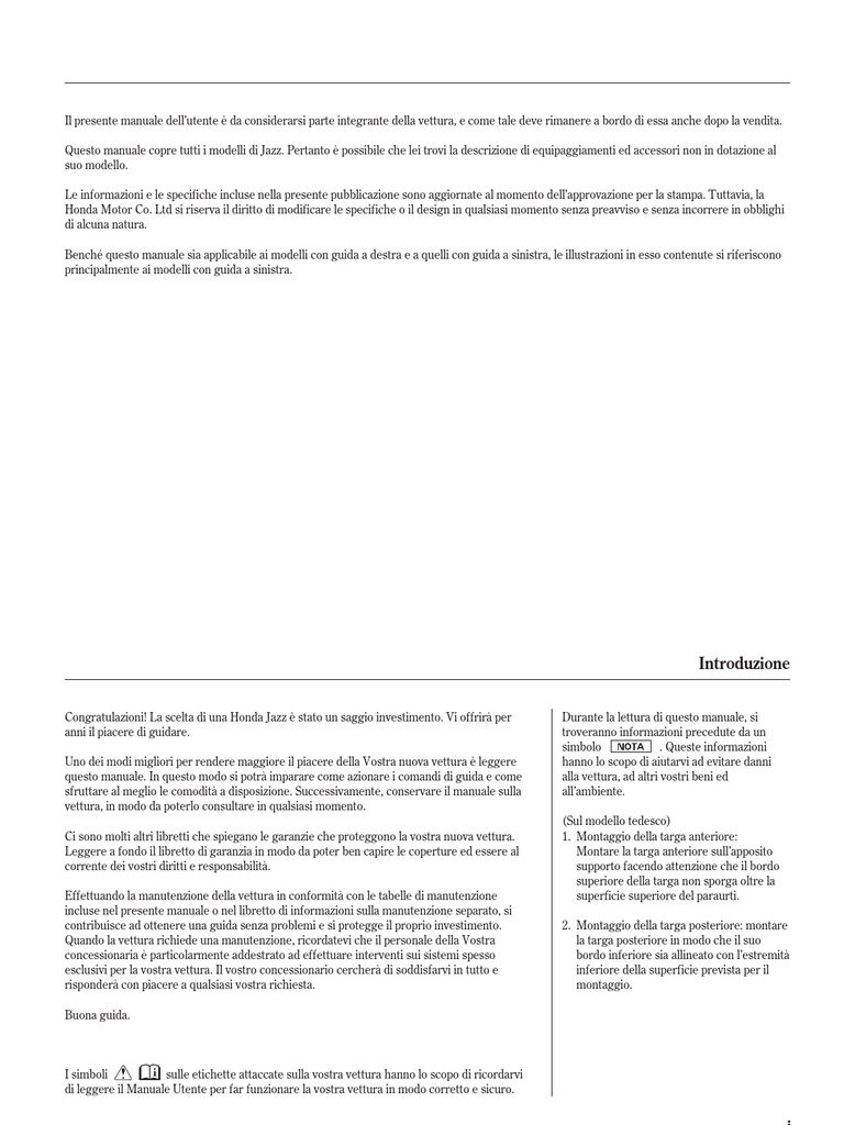 Congratulazioni! La scelta di una Honda Jazz stato un saggio investimento. Vi offrir per anni il piacere di guidare. Uno dei modi migliori per rendere maggiore il piacere della Vostra nuova vettura leggere questo manuale. In questo modo si potr imparare come azionare i comandi di guida e come sfruttare al meglio le comodit a disposizione. Successivamente, conservare il manuale sulla vettura, in modo da poterlo consultare in qualsiasi momento. Ci sono molti altri libretti che spiegano le garanzie che proteggono la vostra nuova vettura. Leggere a fondo il libretto di garanzia in modo da poter ben capire le coperture ed essere al corrente dei vostri diritti e responsabilit. Effettuando la manutenzione della vettura in conformit con le tabelle di manutenzione incluse nel presente manuale o nel libretto di informazioni sulla manutenzione separato, si contribuisce ad ottenere una guida senza problemi e si protegge il proprio investimento. Quando la vettura richiede una manutenzione, ricordatevi che il personale della Vostra concessionaria particolarmente addestrato ad effettuare interventi sui sistemi spesso esclusivi per la vostra vettura. Il vostro concessionario cercher di soddisfarvi in tutto e risponder con piacere a qualsiasi vostra richiesta. Buona guida. Durante la lettura di questo manuale, si troveranno informazioni precedute da un simbolo . Queste informazioni hanno lo scopo di aiutarvi ad evitare danni alla vettura, ad altri vostri beni ed allambiente. (Sul modello tedesco) 1. Montaggio della targa anteriore: Montare la targa anteriore sullapposito supporto facendo attenzione che il bordo superiore della targa non sporga oltre la superficie superiore del paraurti. 2. Montaggio della targa posteriore: montare la targa posteriore in modo che il suo bordo inferiore sia allineato con lestremit inferiore della superficie prevista per il montaggio.