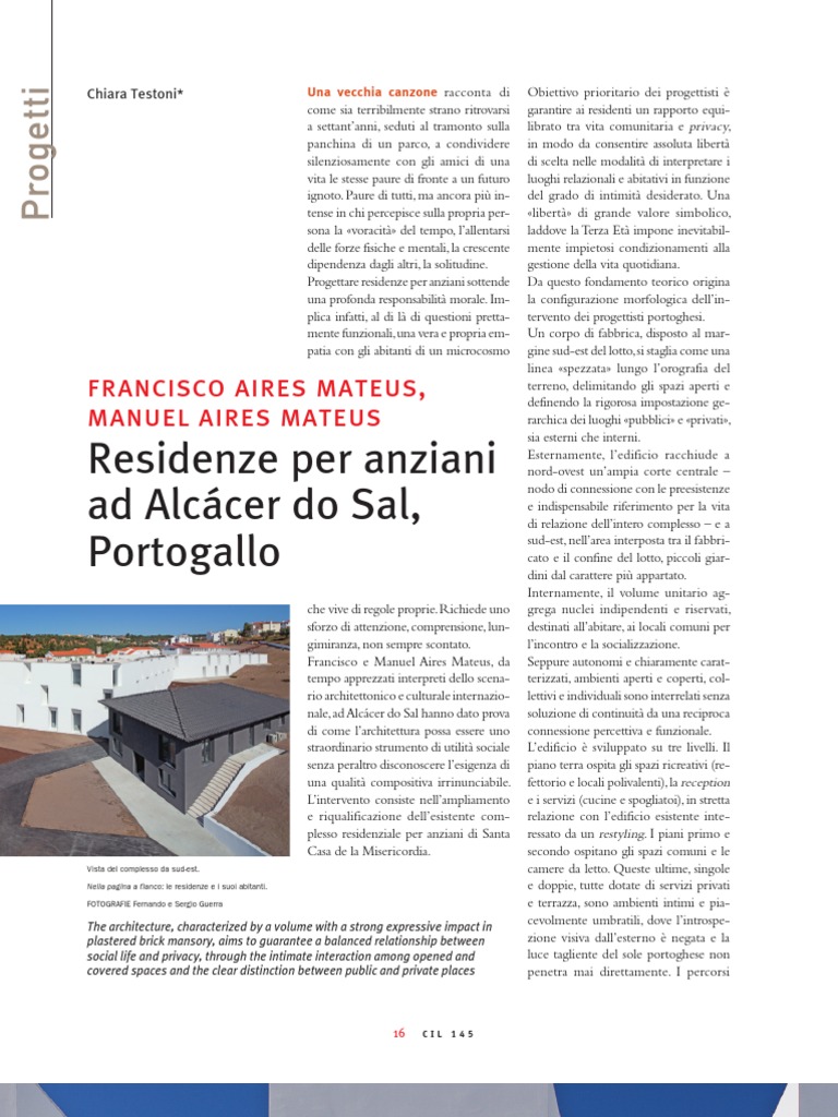 Scheda tecnica Denominazione: Residenze per anziani ad Alccer do Sal, Portogallo Progettisti: Francisco Aires Mateus, Manuel Aires Mateus Collaboratori: Giacomo Brenna, Paola Marini, Anna Bacchetta, Miguel Pereira Strutture: Engitarget, lda Architettura del paesaggio: ABAP Luis Alada Batista Committente: Santa Casa da Misericordia de Alccer do Sal, Portogallo Impresa esecutrice: Ramos Catarino, Sa Superficie calpestabile: 1560 m2 Superficie lorda: 3.640 m2 Superficie del lotto: 10.435 m2 Progettazione: 2006-2007 Realizzazione: 2008-2010