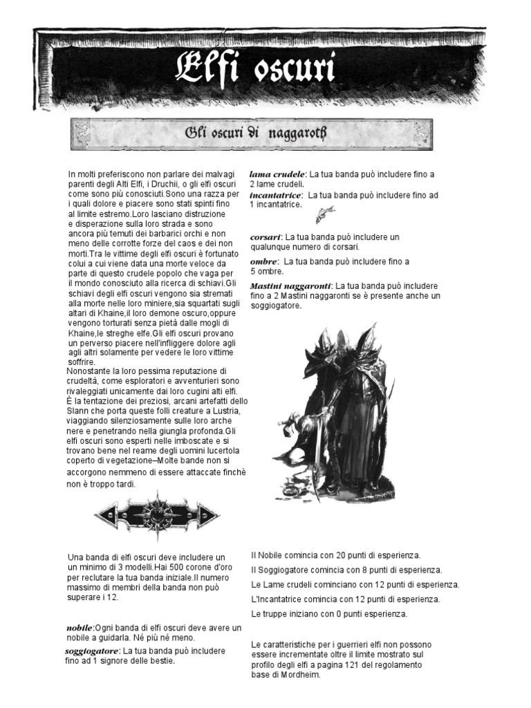 In molti preferiscono non parlare dei malvagi lama crudele: La tua banda pu includere fino a parenti degli Alti Elfi, i Druchii, o gli elfi oscuri 2 lame crudeli. come sono pi [Link] una razza per incantatrice: La tua banda pu includere fino ad i quali dolore e piacere sono stati spinti fino 1 incantatrice. al limite [Link] lasciano distruzione e disperazione sulla loro strada e sono ancora pi temuti dei barbarici orchi e non corsari: La tua banda pu includere un meno delle corrotte forze del caos e dei non qualunque numero di corsari. [Link] le vittime degli elfi oscuri fortunato ombre: La tua banda pu includere fino a colui a cui viene data una morte veloce da 5 ombre. parte di questo crudele popolo che vaga per il mondo conosciuto alla ricerca di [Link] Mastini naggaronti: La tua banda pu includere schiavi degli elfi oscuri vengono sia stremati fino a 2 Mastini naggaronti se presente anche un alla morte nelle loro miniere,sia squartati sugli soggiogatore. altari di Khaine,il loro demone oscuro,oppure vengono torturati senza piet dalle mogli di Khaine,le streghe [Link] elfi oscuri provano un perverso piacere nell'infliggere dolore agli agli altri solamente per vedere le loro vittime soffrire. Nonostante la loro pessima reputazione di crudelt, come esploratori e avventurieri sono rivaleggiati unicamente dai loro cugini alti elfi. la tentazione dei preziosi, arcani artefatti dello Slann che porta queste folli creature a Lustria, viaggiando silenziosamente sulle loro arche nere e penetrando nella giungla [Link] elfi oscuri sono esperti nelle imboscate e si trovano bene nel reame degli uomini lucertola coperto di vegetazioneMolte bande non si accorgono nemmeno di essere attaccate finch non troppo tardi.