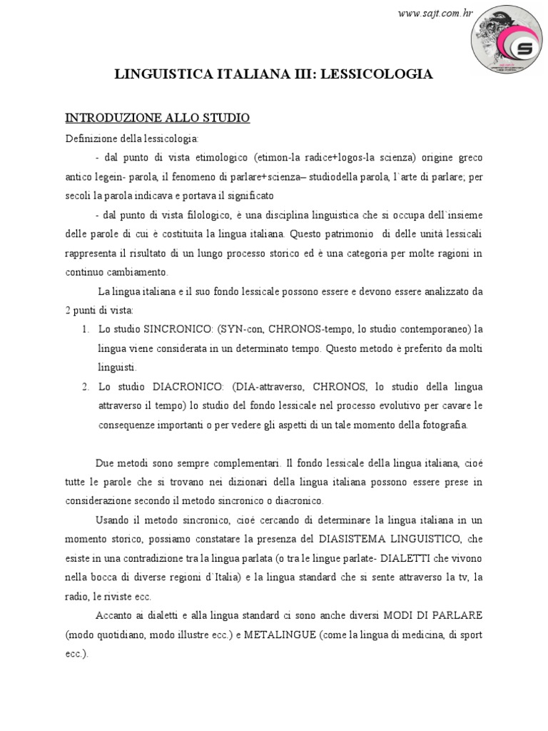 sono in uso con lo stesso significato, e la coesistenza delle doppiette sulla linea parola dottaparola volgare. Cos conosciamo 2 tipi di sinonimia formale o lessicale: FORESTIERISMO-PAROLA ITALIANA sprinter- velocista, autobus, pulman- carriera, tunnel- galleria, basket- pallacanestro, box- pugilato, garage- autorimessa, decolt- scollatura, check- assegno, golman- portiere, record- primato, lift- ascensore, saliscendi PAROLA DOTTA-PAROLA VOLGARE candido- bianco, idioma- lingua, luro- alloro, calesse- carro, bve-bue La sinonimia stilistica esiste sul piano della cosidetta alterazione lessicale. Rappresenta la coesistenza di due termini di cui uno stilisticamente neutro, porta piccola o nessuna carica affettiva e l`altro elemento portatore di un determinato valore stilistico e affettivo, per non mostra nessuna differenza sul piano semantico. Esempi: madre- mamma, padre- babbo, gatto- micio, cane- cucciolo, cavallo- ronzino ALTRI MUTAMENTI SEMANTICI L`allargamento del significato (l`allargamento del campo semantico di una parola) avviene per influsso di altre lingue che vengono in contatto con la lingua italiana per l`atre, commercio, vicinanza ecc. si tratta dei cosidetti calchi linguistici nati per l`estensione del significato. Esempi: -caff- una parola che oggi in Italia non ha un senso unico. Viene dal Sud America e prima di tutto indicava la pianta o il [Link] francese assume il significato del posto dove si prende questa bevanda. Ma questa estensione avviene in Francia, in Italia no. -canna- trska; una pianta. Nel italiano divent il segno dilinguistico del bastone di sostegno, che serve a facilitare il cammino della gente anziana o ammalata, perche era adatto a questo proposito. -marcia- modo di camminare militare, rapido e definito. Poi il significato di questa parola estende anche in italiano e significa la marcia dell`automobile (mjenja brzina). L`evoluzione della societ in tutti gli aspetti fa s che molte parole allargano il loro significato anche senza l`influsso delle lingue straniere. Esempi: -direzione- la strada di cammino (Prendi questa direzione.);carpo direttivo di una citt, ditta, associazione, fabbrica, scuola ecc. -albergo- prima indicava un campo militare, ora sinonimo di hotel 29