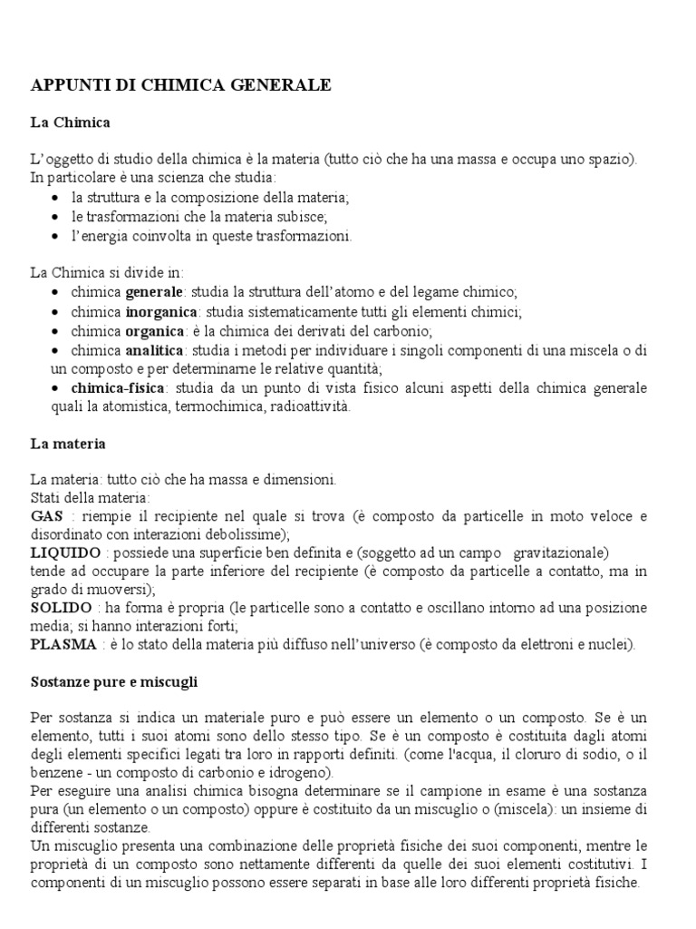 La Chimica Loggetto di studio della chimica la materia (tutto ci che ha una massa e occupa uno spazio). In particolare una scienza che studia: la struttura e la composizione della materia; le trasformazioni che la materia subisce; lenergia coinvolta in queste trasformazioni. La Chimica si divide in: chimica generale: studia la struttura dellatomo e del legame chimico; chimica inorganica: studia sistematicamente tutti gli elementi chimici; chimica organica: la chimica dei derivati del carbonio; chimica analitica: studia i metodi per individuare i singoli componenti di una miscela o di un composto e per determinarne le relative quantit; chimica-fisica: studia da un punto di vista fisico alcuni aspetti della chimica generale quali la atomistica, termochimica, radioattivit. La materia La materia: tutto ci che ha massa e dimensioni. Stati della materia: GAS : riempie il recipiente nel quale si trova ( composto da particelle in moto veloce e disordinato con interazioni debolissime); LIQUIDO : possiede una superficie ben definita e (soggetto ad un campo gravitazionale) tende ad occupare la parte inferiore del recipiente ( composto da particelle a contatto, ma in grado di muoversi); SOLIDO : ha forma propria (le particelle sono a contatto e oscillano intorno ad una posizione media; si hanno interazioni forti; PLASMA : lo stato della materia pi diffuso nelluniverso ( composto da elettroni e nuclei). Sostanze pure e miscugli Per sostanza si indica un materiale puro e pu essere un elemento o un composto. Se un elemento, tutti i suoi atomi sono dello stesso tipo. Se un composto costituita dagli atomi degli elementi specifici legati tra loro in rapporti definiti. (come l'acqua, il cloruro di sodio, o il benzene - un composto di carbonio e idrogeno). Per eseguire una analisi chimica bisogna determinare se il campione in esame una sostanza pura (un elemento o un composto) oppure costituito da un miscuglio o (miscela): un insieme di differenti sostanze. Un miscuglio presenta una combinazione delle propriet fisiche dei suoi componenti, mentre le propriet di un composto sono nettamente differenti da quelle dei suoi elementi costitutivi. I componenti di un miscuglio possono essere separati in base alle loro differenti propriet fisiche.