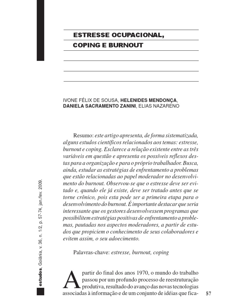 Este trabalho sistematiza os conhecimentos científicos sobre tais construtos e esclarece a relação existente entre o estresse, as estratégias de enfrentamento, a problemas e o burnout, assim como seus possíveis reflexos, nas organizações e nos indivíduos. Ade- mais, este estudo pretende oferecer subsídios para que gestores e trabalhadores utilizem estratégias mais eficazes de enfrentamento