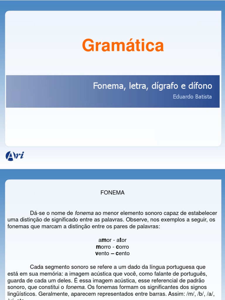 D-se o nome de fonema ao menor elemento sonoro capaz de estabelecer uma distino de significado entre as palavras. Observe, nos exemplos a seguir, os fonemas que marcam a distino entre os pares de palavras: amor - ator morro - corro vento cento Cada segmento sonoro se refere a um dado da lngua portuguesa que est em sua memria: a imagem acstica que voc, como falante de portugus, guarda de cada um deles. essa imagem acstica, esse referencial de padro sonoro, que constitui o fonema. Os fonemas formam os significantes dos signos lingsticos. Geralmente, aparecem representados entre barras. Assim: /m/, /b/, /a/, /v/, etc.
