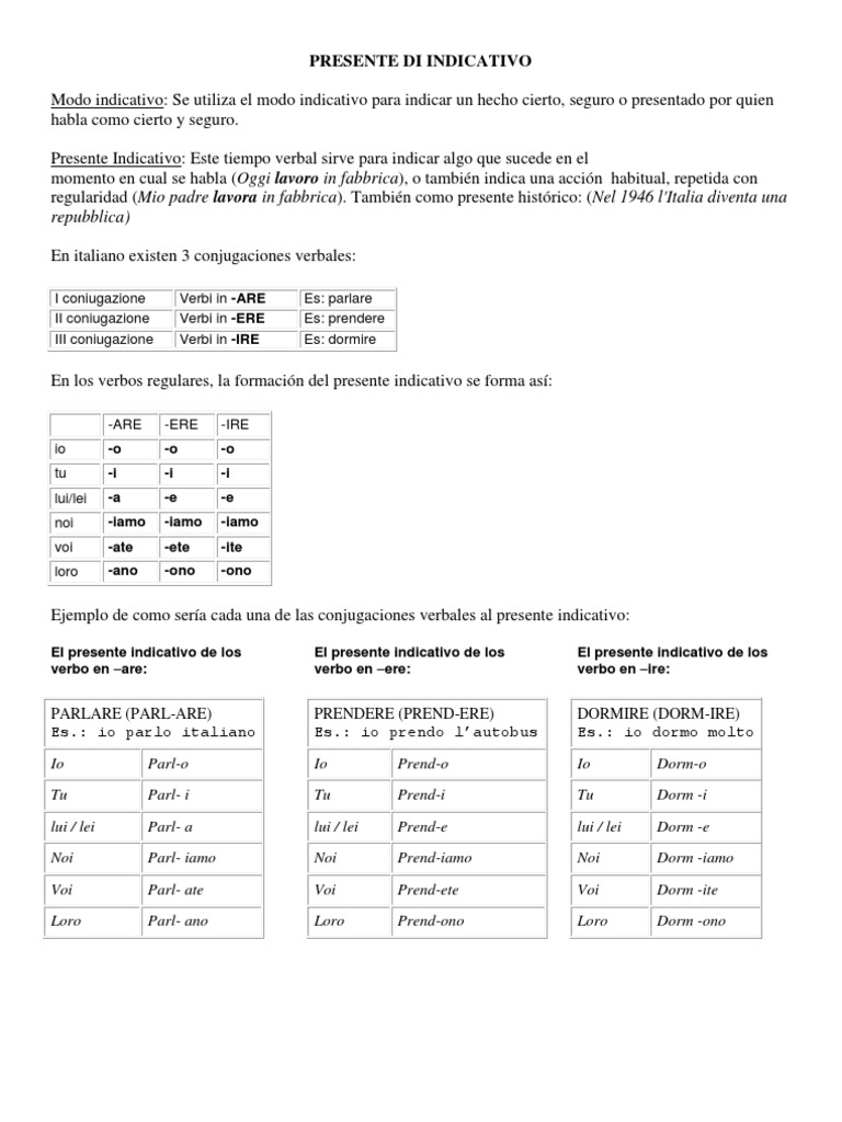 habla como cierto y seguro. Presente Indicativo: Este tiempo verbal sirve para indicar algo que sucede en el momento en cual se habla (Oggi lavoro in fabbrica), o tambin indica una accin habitual, repetida con regularidad (Mio padre lavora in fabbrica). Tambin como presente histrico: (Nel 1946 l'Italia diventa una repubblica) En italiano existen 3 conjugaciones verbales: