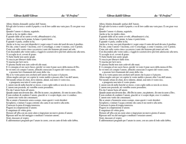 Allora Almitra domand: parlaci dellAmore. Ed egli alz la testa e scrut il popolo, e su di loro cadde una vasta pace. E con gran voce disse: Quando lamore vi chiama, seguitelo, Anche se ha vie ripide e dure. E quando dalle ali ne sarete avvolti, abbandonatevi a lui, Anche se, chiusa tra le penne, la lama vi potr ferire. E quando vi parla, credete in lui, Anche se la sua voce pu disperdervi i sogni come il vento del nord devasta il giardino. Poi che, come lamore vincorona, cos vi crocefigge, e come vi matura, cos vi poter. Come sale sulla vostra cima e accarezza i rami che fremono pi teneri nel sole, Cos discender alle vostre radici, e laggi le scuoter dove pi forti aderiscono alla terra. Vi accoglie in s, covoni di grano. Vi batte finch non sarete spogli. Vi staccia per liberarvi dalle reste. Vi macina per farvi neve. Vi plasma finch non siate cedevoli alle mani. E vi consegna al suo sacro fuoco, perch voi siate il pane sacro della mensa di Dio. In voi tutto ci compie lamore, affinch conosciate il segreto del vostro cuore, e possiate farvi frammenti del cuore della vita. Ma se la vostra paura non cercher nellamore che la pace e il piacere, Allora meglio sar per voi coprire le vostre nudit e passare oltre laia dellamore, Nel mondo orfano di climi, dove riderete, ahim, non tutto il vostro riso, e piangerete non tutto il vostro pianto. Lamore non d nulla fuorch se stesso, e non coglie nulla se non da se stesso. Lamore non possiede, n vorrebbe essere posseduto; Poi che lamore basta allamore. Quando amate non dovreste dire, Ho Dio in cuore, ma piuttosto, Io sono in cuore a Dio. E non crediate di condurre lamore, giacch se vi scopre degni, esso vi conduce. Lamore non vuole che consumarsi. Ma se amate e bramerete senza scampo, siano questi i vostri desideri: Sciogliersi, e imitare lacqua corrente che canta il suo motivo alla notte. Conoscere la pena di troppa tenerezza. Piagarsi in comprensione damore; E sanguinare di voluta gioia. Destarsi allalba con un cuore alato e ringraziare un nuovo giorno damore; Riposare nellora del meriggio e meditare lestasiato amore; Grati, rincasare al vespro; E addormentarsi pregando per lamato in cuore, con un canto di lode sulle labbra.