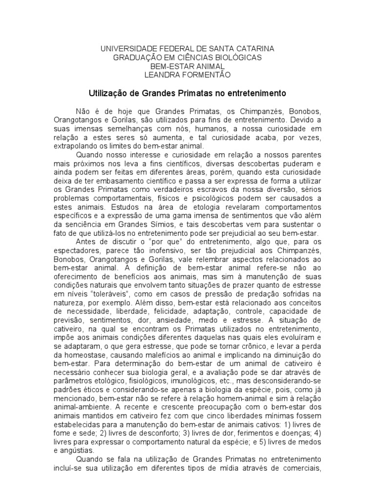 Lei decorrente dos estudos etolgicos em Primatologia e Bem-estar, e a crescente preocupao da populao em relao ao tratamento dos animais em geral, principalmente estes que so to prximos e parecidos conosco. Vale lembrar que o perigo que o animal representa est relacionado sim a sua fora fsica, porm, um animal em condies adequadas dificilmente ataca algum sem motivos, j as situaes nas quais eles vivem quando utilizados no entretenimento s agravam a situao, pois um animal em condies de pssimo bem-estar se torna estressado e suscetvel a crises de nervos. Os Zoolgicos possuem, atualmente, funes de desenvolvimento de pesquisas cientficas, Educao Ambiental, conservao e lazer humano. Com base nos conceitos de bem-estar animal, no h problema em manter Grandes Primatas em Zoolgicos quando estes seguem as normas de bem-estar. Sabe-se que ainda existem Zoolgicos que no se preocupam muito com o bem-estar de seus animais, isso porque ainda no existe uma Legislao especfica para animais de Zoolgico, existem apenas normas estabelecidas pelas Sociedades de Zoolgicos de cada pas. Quando mantidos em condies inadequadas dentro de Zoolgicos, os Grandes Smios podem passar por situaes que infringem todas as cinco liberdades mnimas do bem-estar animal, no entanto, o estabelecimento de condies de bem-estar vem crescendo dentro dos Zoolgicos o que torna vivel que Grandes Primatas continuem sendo mantidos nestes locais, visto que so bastante utilizados e de grande importncia em pesquisas e Educao Ambiental. Referncias BROOM, D. M.; MOLENTO, C. F. M.. Bem-estar animal: conceito e questes relacionadas Reviso. Archives of Veterinary Science, v. 9, n 2, p. 1 11, 2004. DURHAM, E. R.. Chimpanzs tambm amam: a linguagem das emoes na ordem dos primatas. Revista de Antropologia, So Paulo, USP, v. 46 n 1, 2003. YNTERIAN, P. A.. Nossos Irmos Esquecidos. So Paulo: Aruj: Terra Brasilis, 2004. <http://www.projetogap.org.br/> Acesso em 30 de Novembro de 2011