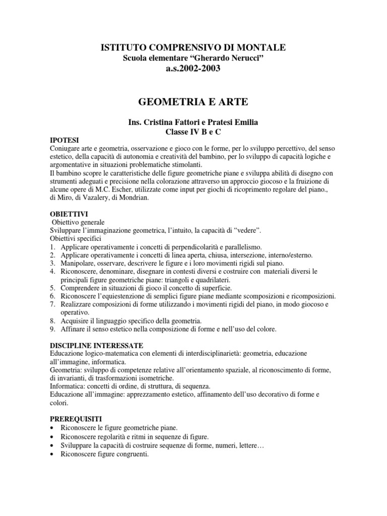 IPOTESI Coniugare arte e geometria, osservazione e gioco con le forme, per lo sviluppo percettivo, del senso estetico, della capacit di autonomia e creativit del bambino, per lo sviluppo di capacit logiche e argomentative in situazioni problematiche stimolanti. Il bambino scopre le caratteristiche delle figure geometriche piane e sviluppa abilit di disegno con strumenti adeguati e precisione nella colorazione attraverso un approccio giocoso e la fruizione di alcune opere di M.C. Escher, utilizzate come input per giochi di ricoprimento regolare del piano., di Miro, di Vazalery, di Mondrian. OBIETTIVI Obiettivo generale Sviluppare limmaginazione geometrica, lintuito, la capacit di vedere. Obiettivi specifici 1. Applicare operativamente i concetti di perpendicolarit e parallelismo. 2. Applicare operativamente i concetti di linea aperta, chiusa, intersezione, interno/esterno. 3. Manipolare, osservare, descrivere le figure e i loro movimenti rigidi sul piano. 4. Riconoscere, denominare, disegnare in contesti diversi e costruire con materiali diversi le principali figure geometriche piane: triangoli e quadrilateri. 5. Comprendere in situazioni di gioco il concetto di superficie. 6. Riconoscere lequiestenzione di semplici figure piane mediante scomposizioni e ricomposizioni. 7. Realizzare composizioni di forme utilizzando i movimenti rigidi del piano, in modo giocoso e operativo. 8. Acquisire il linguaggio specifico della geometria. 9. Affinare il senso estetico nella composizione di forme e nelluso del colore. DISCIPLINE INTERESSATE Educazione logico-matematica con elementi di interdisciplinariet: geometria, educazione allimmagine, informatica. Geometria: sviluppo di competenze relative allorientamento spaziale, al riconoscimento di forme, di invarianti, di trasformazioni isometriche. Informatica: concetti di ordine, di struttura, di sequenza. Educazione allimmagine: apprezzamento estetico, affinamento delluso decorativo di forme e colori. PREREQUISITI Riconoscere le figure geometriche piane. Riconoscere regolarit e ritmi in sequenze di figure. Sviluppare la capacit di costruire sequenze di forme, numeri, lettere Riconoscere figure congruenti.