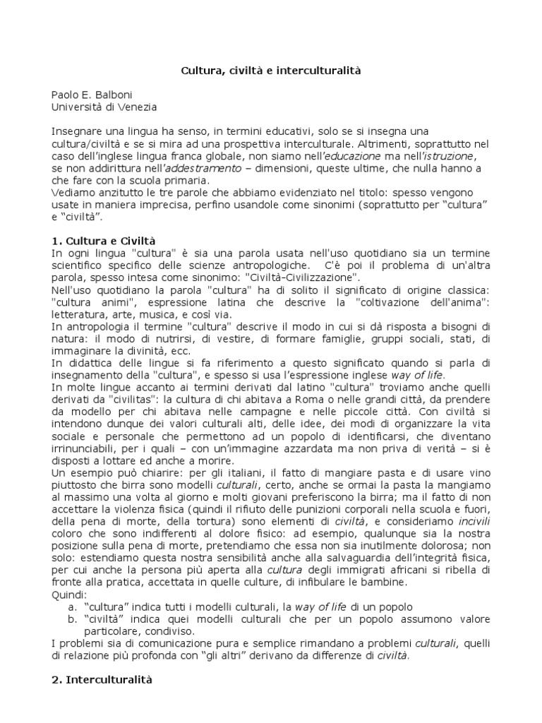cultura/civilt e se si mira ad una prospettiva interculturale. Altrimenti, soprattutto nel