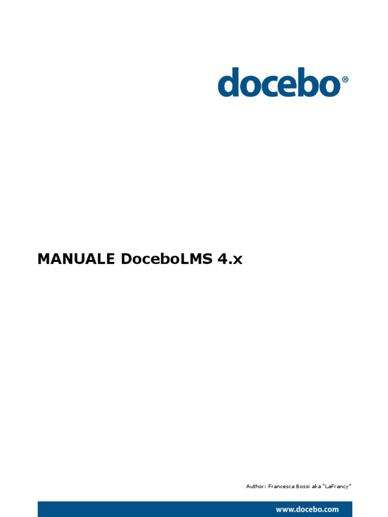 Installazione ...................................................................................................................................... 8 Download dellapplicativo ................................................................................................................. 8 Predisporre un server su Windows in locale ......................................................................................... 8 Predisporre un server su MacOS in locale ...........................................................................................11 PHPMyAdmin .................................................................................................................................13 Creare un nuovo database ...........................................................................................................13 Installare Docebo su Server Remoto .................................................................................................13 Compatibilit e Requisiti ..............................................................................................................13 Dati di accesso al server ..............................................................................................................14 Trasferire i files su server ............................................................................................................14 Installazione .....................................................................................................................................15 Step 1 Benvenuto........................................................................................................................15 Step 2 Informazioni sul server.......................................................................................................16 Step 3 Licenza ............................................................................................................................16 Step 4 Dati del server ..................................................................................................................17 Step 5 Account e lingue................................................................................................................18 Step 6 Creazione del database ......................................................................................................18 Step 7 Installazione completata .....................................................................................................19 Ultime configurazioni ......................................................................................................................19 Upgrade e Patch ................................................................................................................................20 Aggiornare Docebo .........................................................................................................................20 Note per la migrazione da una versione 3.x a 4.x................................................................................20 Installare patch a Docebo 3.x ..........................................................................................................20 Backup ............................................................................................................................................21 Gestione dei problemi ........................................................................................................................21 Quando cerco di caricare files o scorm package il sistema genera messaggi quali "_ERRORUPLOAD" o "[Link] not found"............................................................................................................21 Non vedo i caratteri accentati, apostrofi ecc correttamente...................................................................21 Non ho abbastanza spazio sul server.................................................................................................22 Le E-Mail inviata sono formattate male ..............................................................................................22 Quando uso gli oggetti scorm ricevo errori come "xmldoc has no proprerties" o altri "strani" POPUP javascript ...................................................................................................................................................22 Il server diventa lento e a volte si ferma quando ci sono molte connessioni ............................................22 Introduzione .....................................................................................................................................24 Primo accesso ...............................................................................................................................25 Configuration ....................................................................................................................................29 Settings........................................................................................................................................29 Event manager ..............................................................................................................................30 I/O task........................................................................................................................................31 Code ............................................................................................................................................34 Gestione Utenti ..............................................................................................................................35