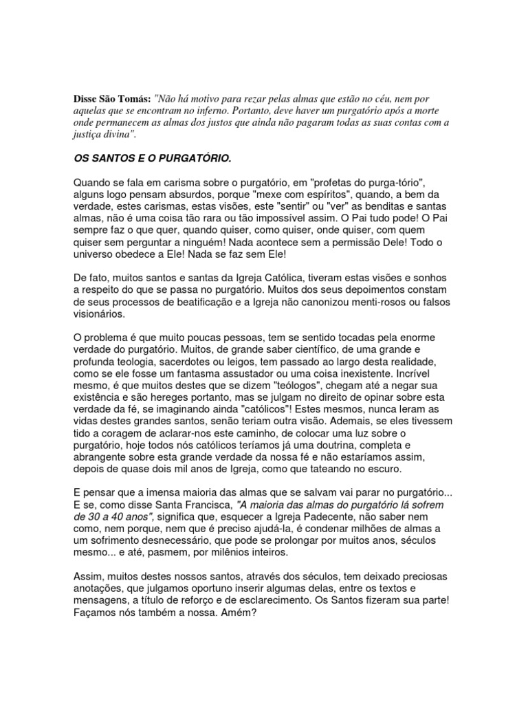 se encontram no inferno. Portanto, deve haver um purgatrio aps a morte onde permanecem as almas dos justos que ainda no pagaram todas as suas contas com a justia divina". OS SANTOS E O PURGATRIO. Quando se fala em carisma sobre o purgatrio, em "profetas do purga-trio", alguns logo pensam absurdos, porque "mexe com espritos", quando, a bem da verdade, estes carismas, estas vises, este "sentir" ou "ver" as benditas e santas almas, no uma coisa to rara ou to impossvel assim. O Pai tudo pode! O Pai sempre faz o que quer, quando quiser, como quiser, onde quiser, com quem quiser sem perguntar a ningum! Nada acontece sem a permisso Dele! Todo o universo obedece a Ele! Nada se faz sem Ele! De fato, muitos santos e santas da Igreja Catlica, tiveram estas vises e sonhos a respeito do que se passa no purgatrio. Muitos dos seus depoimentos constam de seus processos de beatificao e a Igreja no canonizou menti-rosos ou falsos visionrios. O problema que muito poucas pessoas, tem se sentido tocadas pela enorme verdade do purgatrio. Muitos, de grande saber cientfico, de uma grande e profunda teologia, sacerdotes ou leigos, tem passado ao largo desta realidade, como se ele fosse um fantasma assustador ou uma coisa inexistente. Incrvel mesmo, que muitos destes que se dizem "telogos", chegam at a negar sua existncia e so hereges portanto, mas se julgam no direito de opinar sobre esta verdade da f, se imaginando ainda "catlicos"! Estes mesmos, nunca leram as vidas destes grandes santos, seno teriam outra viso. Ademais, se eles tivessem tido a coragem de aclarar-nos este caminho, de colocar uma luz sobre o purgatrio, hoje todos ns catlicos teramos j uma doutrina, completa e abrangente sobre esta grande verdade da nossa f e no estaramos assim, depois de quase dois mil anos de Igreja, como que tateando no escuro. E pensar que a imensa maioria das almas que se salvam vai parar no purgatrio... E se, como disse Santa Francisca, "A maioria das almas do purgatrio l sofrem de 30 a 40 anos", significa que, esquecer a Igreja Padecente, no saber nem como, nem porque, nem que preciso ajud-la, condenar milhes de almas a um sofrimento desnecessrio, que pode se prolongar por muitos anos, sculos mesmo... e at, pasmem, por milnios inteiros. Assim, muitos destes nossos santos, atravs dos sculos, tem deixado preciosas anotaes, que julgamos oportuno inserir algumas delas, entre os textos e mensagens, a ttulo de reforo e de esclarecimento. Os Santos fizeram sua parte! Faamos ns tambm a nossa. Amm?