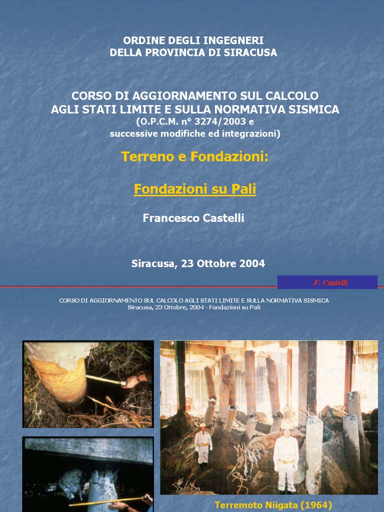 CORSO DI AGGIORNAMENTO SUL CALCOLO AGLI STATI LIMITE E SULLA NORMATIVA SISMICA Siracusa, 23 Ottobre, 2004 - Fondazioni su Pali