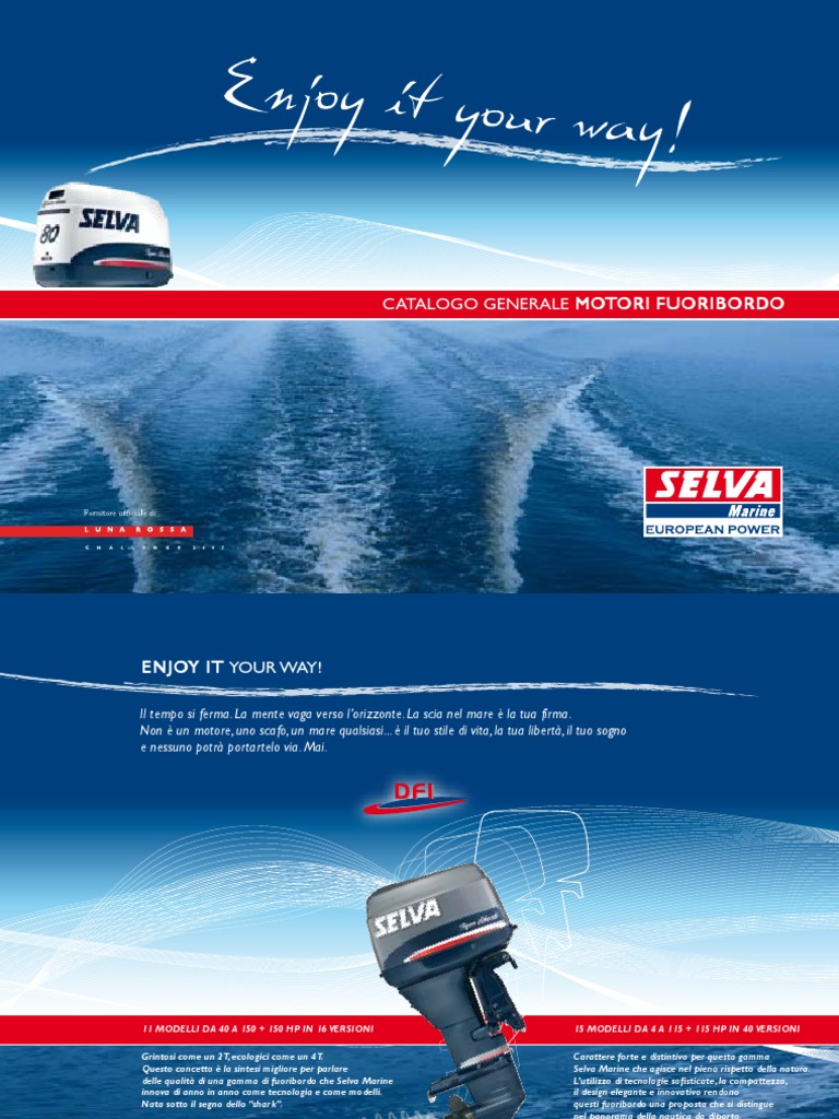 Per navigare con forza e determinazione, Selva Marine presenta 11 modelli di motori fuoribordo a 2 tempi da 5 a 80 Hp, in oltre 20 versioni: leggeri, potenti, innovativi nelle prestazioni ma semplici nei comandi e nei sistemi operativi. I loro nomi richiamano alla mente i colori, i sapori e le sensazioni del mare: Maiorca, Portofino, [Link], Capri... paesaggi unici che la forza di un motore a due tempi rende ancora pi familiari ed indimenticabili. Il sistema di miscelazione automatica Multipoint Autolube, che inietta di volta in volta nei cilindri la giusta quantit di olio richiesta dal motore, e la Formula Package, che abbina ogni motore alle imbarcazioni pi adeguate per peso, dimensioni ed estetica, fanno di questi motori i compagni pi fedeli ed affidabili per assaporare il gusto della libert. N.B. - DIRETTIVA 2003/44/CE: modelli disponibili fino ad esaurimento scorte