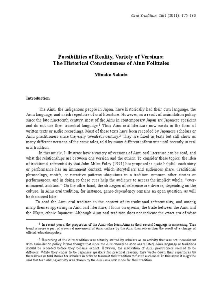 . Ainu Oral Tradition as a Representation of the Past: Uwepeker and Upaskuma. Komaba Journal of Area Studies, 9:70-94.
