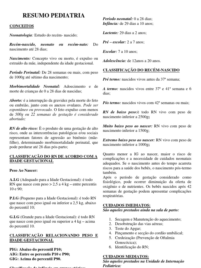 Perodo neonatal: 0 a 28 dias; Infncia: de 29 dias a 10 anos; Lactente: 29 dias a 2 anos; Pr escolar: 2 a 7 anos; Escolar: 7 a 10 anos; Adolescncia: de 12anos a 20 anos. CLASSIFICAO DO RECM-NASCIDO Pr termo: nascidos vivos antes da 37 semana; A termo: nascidos vivos entre 37 e 41 semana e 6 dias; Ps termo: nascidos vivos com 42 semanas ou mais; RN de baixo peso: todo RN vivo com peso de nascimento inferior a 2500g; Muito baixo peso ao nascer: RN vivo com peso de nascimento inferior a 1500g; Extremo baixo peso ao nascer: RN vivo com peso de nascimento inferior a 1000g; Quanto menor a IG ao nascer, maior o risco de complicaes e a necessidade de cuidados neonatais adequados. Se o nascimento antes do tempo acarreta riscos para a sade dos bebs, o nascimento ps-termo tambm. Aps o perodo de gestao considerado como fisiolgico, pode ocorrer diminuio da oferta de oxignio e de nutrientes. Os bebs nascidos aps 42 semanas de gestao podem apresentar complicaes respiratrias. CUIDADOS IMEDIATOS: So aqueles prestados ainda na sala de parto: 1. 2. 3. 4. 5. Secagem e Manuteno do aquecimento; Desobstruo das vias areas; Teste do Apgar; Pinamento e seco do cordo umbilical; Credeizao (Preveno de Oftalmia Gonoccica); 6. Identificao do RN; CUIDADOS MEDIATOS: So aqueles prestados na Unidade de Internao Pediatrica: