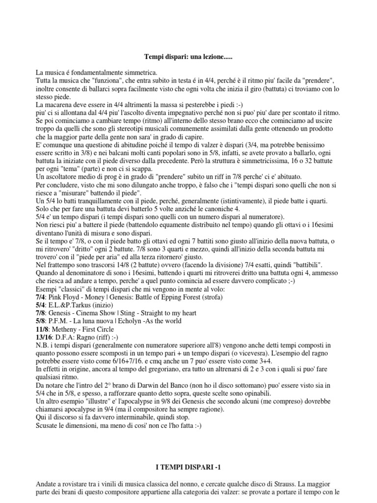 . Tutta la musica che "funziona", che entra subito in testa in 4/4, perch il ritmo piu' facile da "prendere", inoltre consente di ballarci sopra facilmente visto che ogni volta che inizia il giro (battuta) ci troviamo con lo stesso piede. La macarena deve essere in 4/4 altrimenti la massa si pesterebbe i piedi :-) piu' ci si allontana dal 4/4 piu' l'ascolto diventa impegnativo perch non si puo' piu' dare per scontato il ritmo. Se poi cominciamo a cambiare tempo (ritmo) all'interno dello stesso brano ecco che cominciamo ad uscire troppo da quelli che sono gli stereotipi musicali comunemente assimilati dalla gente ottenendo un prodotto che la maggior parte della gente non sara' in grado di capire. E' comunque una questione di abitudine poich il tempo di valzer dispari (3/4, ma potrebbe benissimo essere scritto in 3/8) e nei balcani molti canti popolari sono in 5/8, infatti, se avete provato a ballarlo, ogni battuta la iniziate con il piede diverso dalla precedente. Per la struttura simmetricissima, 16 o 32 battute per ogni "tema" (parte) e non ci si scappa. Un ascoltatore medio di prog in grado di "prendere" subito un riff in 7/8 perche' ci e' abituato. Per concludere, visto che mi sono dilungato anche troppo, falso che i "tempi dispari sono quelli che non si riesce a "misurare" battendo il piede". Un 5/4 lo batti tranquillamente con il piede, perch, generalmente (istintivamente), il piede batte i quarti. Solo che per fare una battuta devi batterlo 5 volte anzich le canoniche 4. 5/4 e' un tempo dispari (i tempi dispari sono quelli con un numero dispari al numeratore). Non riesci piu' a battere il piede (battendolo equamente distribuito nel tempo) quando gli ottavi o i 16esimi diventano l'unit di misura e sono dispari. Se il tempo e' 7/8, o con il piede batto gli ottavi ed ogni 7 battiti sono giusto all'inizio della nuova battuta, o mi ritrovero' "dritto" ogni 2 battute. 7/8 sono 3 quarti e mezzo, quindi all'inizio della seconda battuta mi trovero' con il "piede per aria" ed alla terza ritornero' giusto. Nel frattempo sono trascorsi 14/8 (2 battute) ovvero (facendo la divisione) 7/4 esatti, quindi "battibili". Quando al denominatore di sono i 16esimi, battendo i quarti mi ritroverei dritto una battuta ogni 4, ammesso che riesca ad andare a tempo, perche' a quel punto comincia ad essere davvero complicato ;-) Esempi "classici" di tempi dispari che mi vengono in mente al volo: 7/4: Pink Floyd - Money | Genesis: Battle of Epping Forest (strofa) 5/4: E.L.&[Link] (inizio) 7/8: Genesis - Cinema Show | Sting - Straight to my heart 5/8: P.F.M. - La luna nuova | Echolyn -As the world 11/8: Metheny - First Circle 13/16: D.F.A: Ragno (riff) :-) N.B. i tempi dispari (generalmente con numeratore superiore all'8) vengono anche detti tempi composti in quanto possono essere scomposti in un tempo pari + un tempo dispari (o vicevesra). L'esempio del ragno potrebbe essere visto come 6/16+7/16. e cmq anche un 7 puo' essere visto come 3+4. In effetti in origine, ancora al tempo del gregoriano, era tutto un altrenarsi di 2 e 3 con i quali si puo' fare qualsiasi ritmo. Da notare che l'intro del 2 brano di Darwin del Banco (non ho il disco sottomano) puo' essere visto sia in 5/4 che in 5/8, e spesso, a rafforzare quanto detto sopra, queste scelte sono opinabili. Un altro esempio "illustre" e' l'apocalypse in 9/8 dei Genesis che secondo alcuni (me compreso) dovrebbe chiamarsi apocalypse in 9/4 (ma il compositore ha sempre ragione). Qui il discorso si fa davvero interminabile, quindi stop. Scusate le dimensioni, ma meno di cosi' non ce l'ho fatta :-)