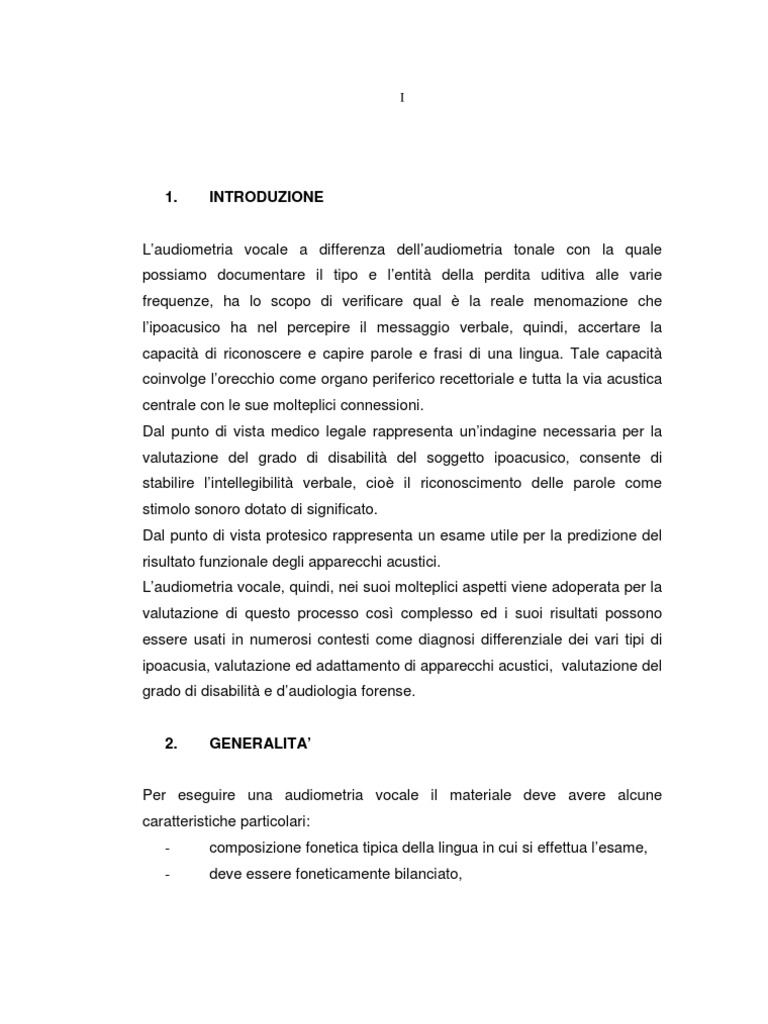Laudiometria vocale a differenza dellaudiometria tonale con la quale possiamo documentare il tipo e lentit della perdita uditiva alle varie frequenze, ha lo scopo di verificare qual la reale menomazione che lipoacusico ha nel percepire il messaggio verbale, quindi, accertare la capacit di riconoscere e capire parole e frasi di una lingua. Tale capacit coinvolge lorecchio come organo periferico recettoriale e tutta la via acustica centrale con le sue molteplici connessioni. Dal punto di vista medico legale rappresenta unindagine necessaria per la valutazione del grado di disabilit del soggetto ipoacusico, consente di stabilire lintellegibilit verbale, cio il riconoscimento delle parole come stimolo sonoro dotato di significato. Dal punto di vista protesico rappresenta un esame utile per la predizione del risultato funzionale degli apparecchi acustici. Laudiometria vocale, quindi, nei suoi molteplici aspetti viene adoperata per la valutazione di questo processo cos complesso ed i suoi risultati possono essere usati in numerosi contesti come diagnosi differenziale dei vari tipi di ipoacusia, valutazione ed adattamento di apparecchi acustici, valutazione del grado di disabilit e daudiologia forense. 2. GENERALITA