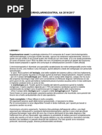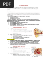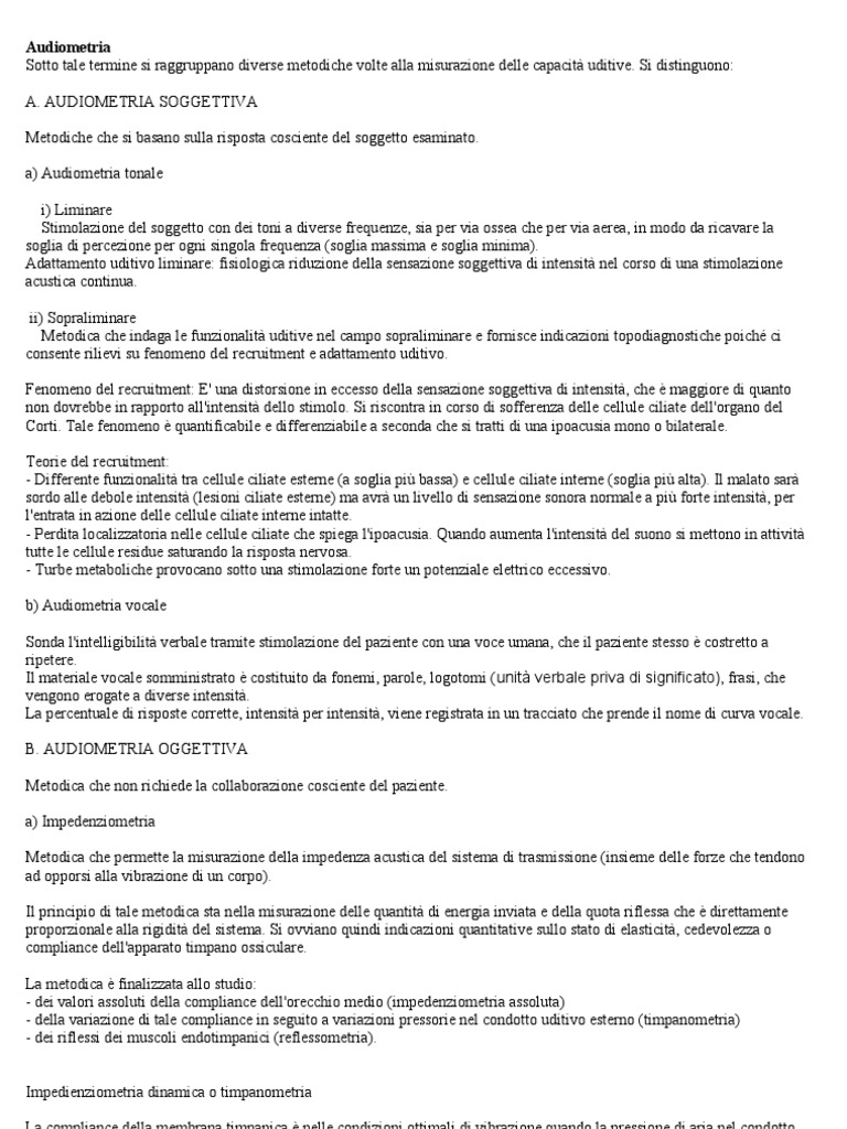 AUDIOMETRIA SOGGETTIVA Metodiche che si basano sulla risposta cosciente del soggetto esaminato. a) Audiometria tonale i) Liminare Stimolazione del soggetto con dei toni a diverse frequenze, sia per via ossea che per via aerea, in modo da ricavare la soglia di percezione per ogni singola frequenza (soglia massima e soglia minima). Adattamento uditivo liminare: fisiologica riduzione della sensazione soggettiva di intensit nel corso di una stimolazione acustica continua. ii) Sopraliminare Metodica che indaga le funzionalit uditive nel campo sopraliminare e fornisce indicazioni topodiagnostiche poich ci consente rilievi su fenomeno del recruitment e adattamento uditivo. Fenomeno del recruitment: E' una distorsione in eccesso della sensazione soggettiva di intensit, che maggiore di quanto non dovrebbe in rapporto all'intensit dello stimolo. Si riscontra in corso di sofferenza delle cellule ciliate dell'organo del Corti. Tale fenomeno quantificabile e differenziabile a seconda che si tratti di una ipoacusia mono o bilaterale. Teorie del recruitment: - Differente funzionalit tra cellule ciliate esterne (a soglia pi bassa) e cellule ciliate interne (soglia pi alta). Il malato sar sordo alle debole intensit (lesioni ciliate esterne) ma avr un livello di sensazione sonora normale a pi forte intensit, per l'entrata in azione delle cellule ciliate interne intatte. - Perdita localizzatoria nelle cellule ciliate che spiega l'ipoacusia. Quando aumenta l'intensit del suono si mettono in attivit tutte le cellule residue saturando la risposta nervosa. - Turbe metaboliche provocano sotto una stimolazione forte un potenziale elettrico eccessivo. b) Audiometria vocale Sonda l'intelligibilit verbale tramite stimolazione del paziente con una voce umana, che il paziente stesso costretto a ripetere. Il materiale vocale somministrato costituito da fonemi, parole, logotomi ( unit verbale priva di significato), frasi, che vengono erogate a diverse intensit. La percentuale di risposte corrette, intensit per intensit, viene registrata in un tracciato che prende il nome di curva vocale. B. AUDIOMETRIA OGGETTIVA Metodica che non richiede la collaborazione cosciente del paziente. a) Impedenziometria Metodica che permette la misurazione della impedenza acustica del sistema di trasmissione (insieme delle forze che tendono ad opporsi alla vibrazione di un corpo). Il principio di tale metodica sta nella misurazione delle quantit di energia inviata e della quota riflessa che direttamente proporzionale alla rigidit del sistema. Si ovviano quindi indicazioni quantitative sullo stato di elasticit, cedevolezza o compliance dell'apparato timpano ossiculare. La metodica finalizzata allo studio: - dei valori assoluti della compliance dell'orecchio medio (impedenziometria assoluta) - della variazione di tale compliance in seguito a variazioni pressorie nel condotto uditivo esterno (timpanometria) - dei riflessi dei muscoli endotimpanici (reflessometria). Impedienziometria dinamica o timpanometria La compliance della membrana timpanica nelle condizioni ottimali di vibrazione quando la pressione di aria nel condotto