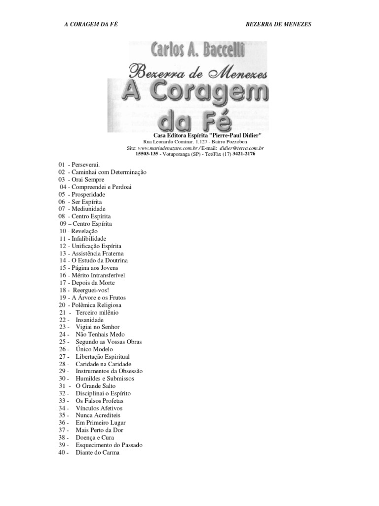 01 - Perseverai. 02 - Caminhai com Determinao 03 - Orai Sempre 04 - Compreendei e Perdoai 05 - Prosperidade 06 - Ser Esprita 07 - Mediunidade 08 - Centro Esprita 09 Centro Esprita 10 - Revelao 11 - Infalibilidade 12 - Unificao Esprita 13 - Assistncia Fraterna 14 - O Estudo da Doutrina 15 - Pgina aos Jovens 16 - Mrito Intransfervel 17 - Depois da Morte 18 - Reerguei-vos! 19 - A rvore e os Frutos 20 - Polmica Religiosa 21 - Terceiro milnio 22 - Insanidade 23 - Vigiai no Senhor 24 - No Tenhais Medo 25 - Segundo as Vossas Obras 26 - nico Modelo 27 - Libertao Espiritual 28 - Caridade na Caridade 29 - Instrumentos da Obsesso 30 - Humildes e Submissos 31 - O Grande Salto 32 - Disciplinai o Esprito 33 - Os Falsos Profetas 34 - Vnculos Afetivos 35 - Nunca Acrediteis 36 - Em Primeiro Lugar 37 - Mais Perto da Dor 38 - Doena e Cura 39 - Esquecimento do Passado 40 - Diante do Carma