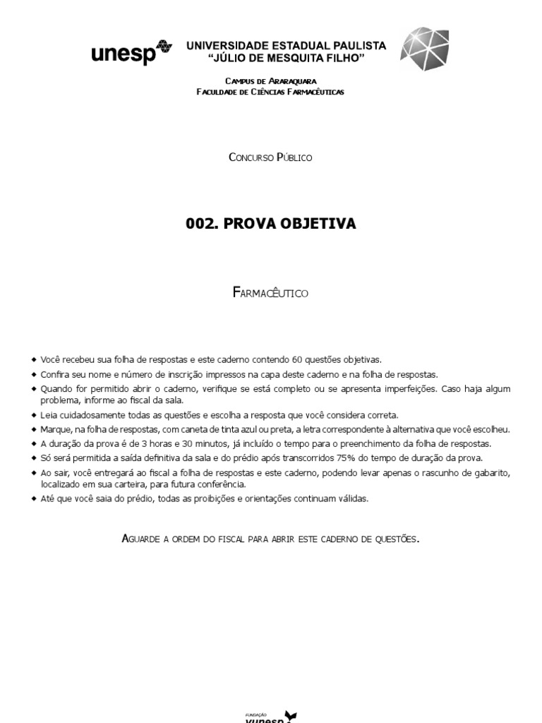 Voc recebeu sua folha de respostas e este caderno contendo 60 questes objetivas. Confira seu nome e nmero de inscrio impressos na capa deste caderno e na folha de respostas. Quando for permitido abrir o caderno, verifique se est completo ou se apresenta imperfeies. Caso haja algum problema, informe ao fiscal da sala. Leia cuidadosamente todas as questes e escolha a resposta que voc considera correta. Marque, na folha de respostas, com caneta de tinta azul ou preta, a letra correspondente alternativa que voc escolheu. A durao da prova de 3 horas e 30 minutos, j includo o tempo para o preenchimento da folha de respostas. S ser permitida a sada definitiva da sala e do prdio aps transcorridos 75% do tempo de durao da prova. Ao sair, voc entregar ao fiscal a folha de respostas e este caderno, podendo levar apenas o rascunho de gabarito, localizado em sua carteira, para futura conferncia. At que voc saia do prdio, todas as proibies e orientaes continuam vlidas.