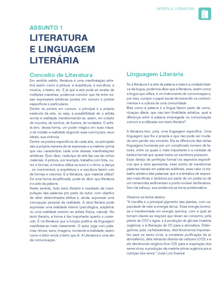 Se a literatura a arte da palavra e esta a unidade bsica da lngua, podemos dizer que a literatura, assim como a lngua que utiliza, um instrumento de comunicao e, por isso, cumpre o papel social de transmitir os conhecimentos e a cultura de uma comunidade. Mas como a palavra e a lngua fazem parte da comunicao diria, que no tem finalidade artstica, qual a diferena entre a palavra empregada na comunicao comum e a utilizada num texto literrio? A literatura tem, pois, uma linguagem especfica. Uma linguagem que lhe prpria e que no pode ser mudada sem perder seu encanto. Ela se diferencia das vrias linguagens humanas por um complicado nmero de fatores, entre os quais o mais importante a vontade de beleza formal que quase todos os escritores possuem. Esse desejo de perfeio formal (os aspectos especfi cos que a obra apresenta), esse sonho de transformar palavras banais em palavras sublimes, esse valor (o trabalho artstico das palavras) que a tentativa de expresso mais eficaz e sedutora por parte de um poeta ou de um romancista sedimentam o ponto nuclear da literatura. Sem tal esforo, sua existncia se torna problemtica. Observe os textos abaixo: A clorofila o principal pigmento das plantas, com capacidade de reter a energia da luz. Essa energia luminosa transformada em energia qumica, com a qual se tornam viveis as reaes que levam ao consumo, pela planta de CO2 e gua, e produo de glicose (matria orgnica) e liberao de O2 para a atmosfera. Distinguimos, pois, na fotossntese, dois fenmenos importantes para os seres vivos: a constante purificao do ar atmosfrico, dele retirando dixido de carbono (CO2) e a ele devolvendo oxignio livre (O2) para a respirao dos seres vivos; a produo da matria-prima orgnica pra a nutrio dos seres. (Jos Lus Soares)