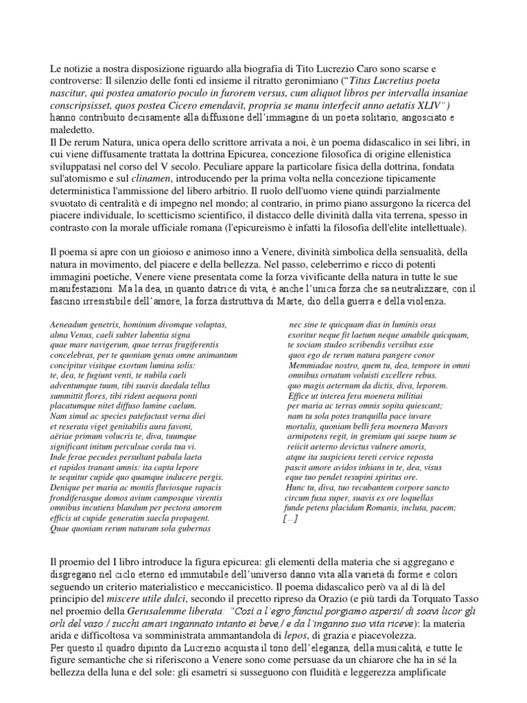 ed insieme il ritratto geronimiano (Titus Lucretius poeta nascitur, qui postea amatorio poculo in furorem versus, cum aliquot libros per intervalla insaniae conscripsisset, quos postea Cicero emendavit, propria se manu interfecit anno aetatis XLIV) hanno contribuito decisamente alla diffusione dellimmagine di un poeta solitario, angosciato e maledetto. Il De rerum Natura, unica opera dello scrittore arrivata a noi, un poema didascalico in sei libri, in cui viene diffusamente trattata la dottrina Epicurea, concezione filosofica di origine ellenistica sviluppatasi nel corso del V secolo. Peculiare appare la particolare fisica della dottrina, fondata sul'atomismo e sul clinamen, introducendo per la prima volta nella concezione tipicamente deterministica l'ammissione del libero arbitrio. Il ruolo dell'uomo viene quindi parzialmente svuotato di centralit e di impegno nel mondo; al contrario, in primo piano assurgono la ricerca del piacere individuale, lo scetticismo scientifico, il distacco delle divinit dalla vita terrena, spesso in contrasto con la morale ufficiale romana (l'epicureismo infatti la filosofia dell'elite intellettuale). Il poema si apre con un gioioso e animoso inno a Venere, divinit simbolica della sensualit, della natura in movimento, del piacere e della bellezza. Nel passo, celeberrimo e ricco di potenti immagini poetiche, Venere viene presentata come la forza vivificante della natura in tutte le sue manifestazioni. Ma la dea, in quanto datrice di vita, anche lunica forza che sa neutralizzare, con il fascino irresistibile dellamore, la forza distruttiva di Marte, dio della guerra e della violenza.