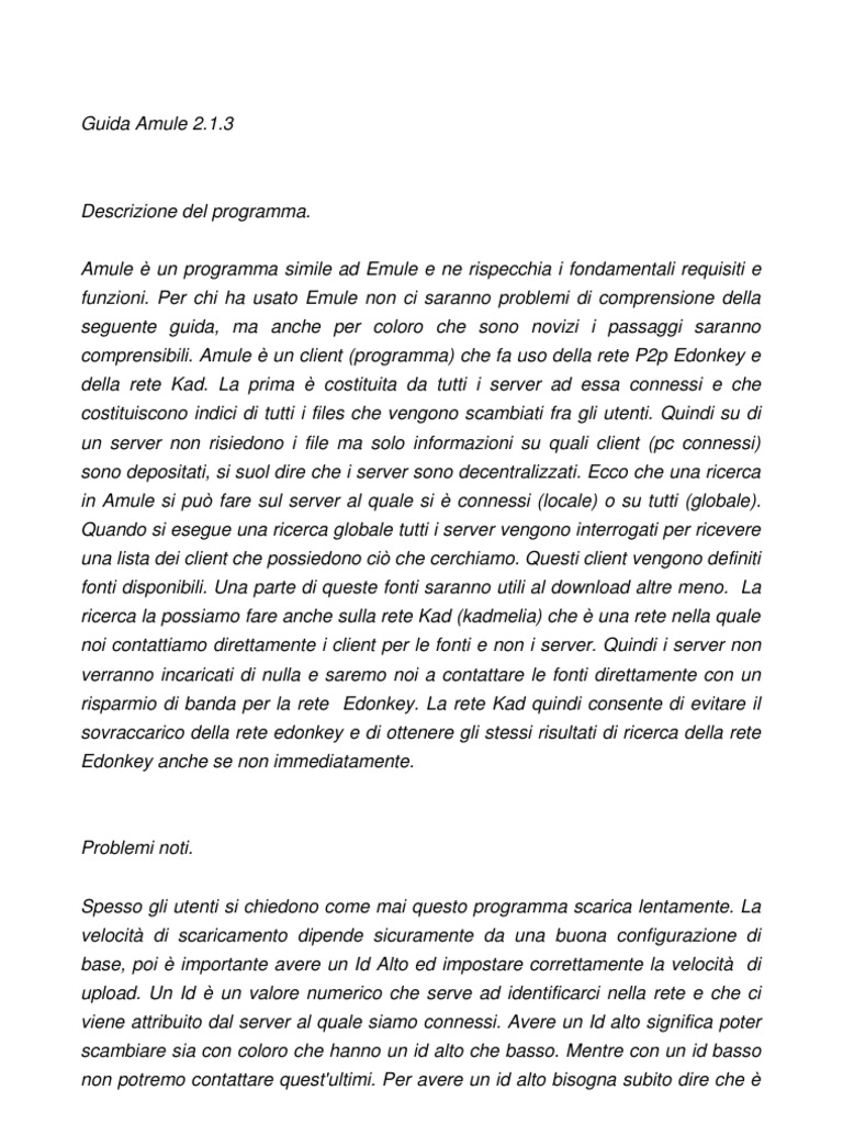 Descrizione del programma. Amule un programma simile ad Emule e ne rispecchia i fondamentali requisiti e funzioni. Per chi ha usato Emule non ci saranno problemi di comprensione della comprensibili. Amule un client (programma) che fa uso della rete P2p Edonkey e seguente guida, ma anche per coloro che sono novizi i passaggi saranno della rete Kad. La prima costituita da tutti i server ad essa connessi e che costituiscono indici di tutti i files che vengono scambiati fra gli utenti. Quindi su di un server non risiedono i file ma solo informazioni su quali client (pc connessi) sono depositati, si suol dire che i server sono decentralizzati. Ecco che una ricerca in Amule si pu fare sul server al quale si connessi (locale) o su tutti (globale). Quando si esegue una ricerca globale tutti i server vengono interrogati per ricevere una lista dei client che possiedono ci che cerchiamo. Questi client vengono definiti ricerca la possiamo fare anche sulla rete Kad (kadmelia) che una rete nella quale