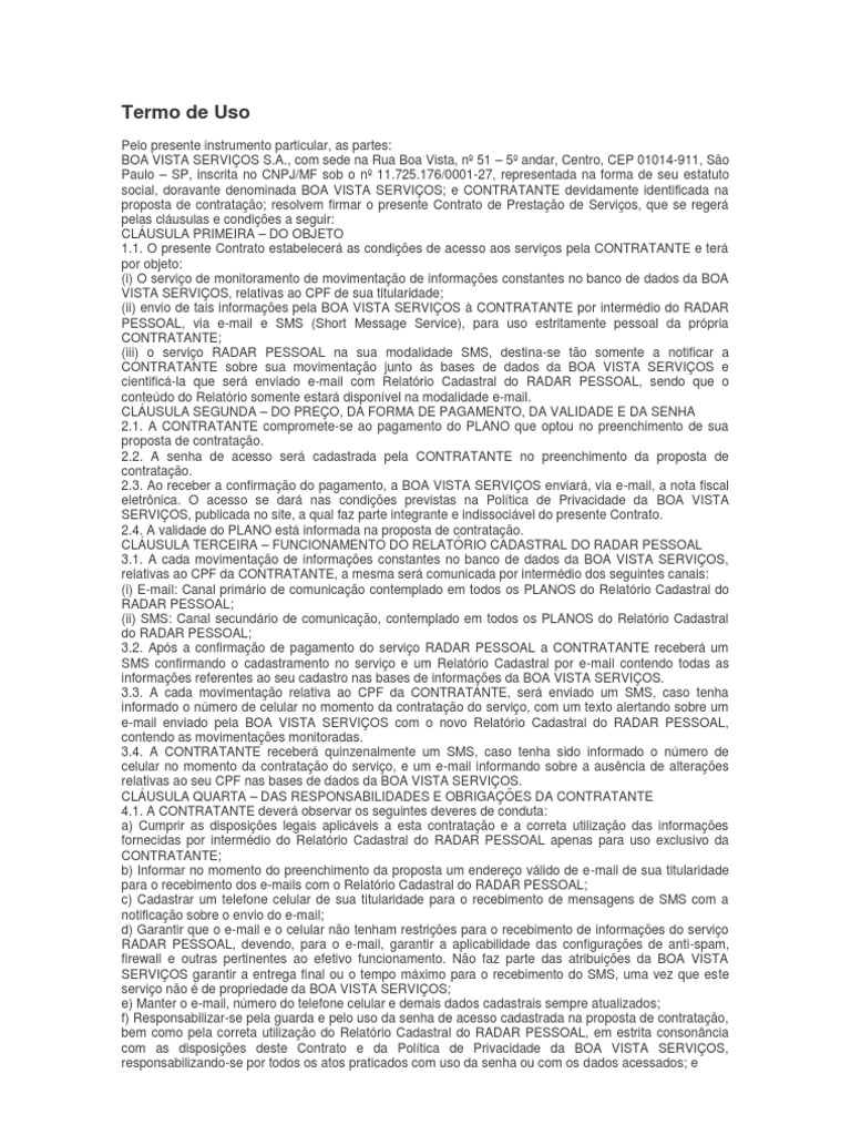 Pelo presente instrumento particular, as partes: BOA VISTA SERVIOS S.A., com sede na Rua Boa Vista, n 51 5 andar, Centro, CEP 01014-911, So Paulo SP, inscrita no CNPJ/MF sob o n 11.725.176/0001-27, representada na forma de seu estatuto social, doravante denominada BOA VISTA SERVIOS; e CONTRATANTE devidamente identificada na proposta de contratao; resolvem firmar o presente Contrato de Prestao de Servios, que se reger pelas clusulas e condies a seguir: CLUSULA PRIMEIRA DO OBJETO 1.1. O presente Contrato estabelecer as condies de acesso aos servios pela CONTRATANTE e ter por objeto: (i) O servio de monitoramento de movimentao de informaes constantes no banco de dados da BOA VISTA SERVIOS, relativas ao CPF de sua titularidade; (ii) envio de tais informaes pela BOA VISTA SERVIOS CONTRATANTE por intermdio do RADAR PESSOAL, via e-mail e SMS (Short Message Service), para uso estritamente pessoal da prpria CONTRATANTE; (iii) o servio RADAR PESSOAL na sua modalidade SMS, destina-se to somente a notificar a CONTRATANTE sobre sua movimentao junto s bases de dados da BOA VISTA SERVIOS e cientific-la que ser enviado e-mail com Relatrio Cadastral do RADAR PESSOAL, sendo que o contedo do Relatrio somente estar disponvel na modalidade e-mail. CLUSULA SEGUNDA DO PREO, DA FORMA DE PAGAMENTO, DA VALIDADE E DA SENHA 2.1. A CONTRATANTE compromete-se ao pagamento do PLANO que optou no preenchimento de sua proposta de contratao. 2.2. A senha de acesso ser cadastrada pela CONTRATANTE no preenchimento da proposta de contratao. 2.3. Ao receber a confirmao do pagamento, a BOA VISTA SERVIOS enviar, via e-mail, a nota fiscal eletrnica. O acesso se dar nas condies previstas na Poltica de Privacidade da BOA VISTA SERVIOS, publicada no site, a qual faz parte integrante e indissocivel do presente Contrato. 2.4. A validade do PLANO est informada na proposta de contratao. CLUSULA TERCEIRA FUNCIONAMENTO DO RELATRIO CADASTRAL DO RADAR PESSOAL 3.1. A cada movimentao de informaes constantes no banco de dados da BOA VISTA SERVIOS, relativas ao CPF da CONTRATANTE, a mesma ser comunicada por intermdio dos seguintes canais: (i) E-mail: Canal primrio de comunicao contemplado em todos os PLANOS do Relatrio Cadastral do RADAR PESSOAL; (ii) SMS: Canal secundrio de comunicao, contemplado em todos os PLANOS do Relatrio Cadastral do RADAR PESSOAL; 3.2. Aps a confirmao de pagamento do servio RADAR PESSOAL a CONTRATANTE receber um SMS confirmando o cadastramento no servio e um Relatrio Cadastral por e-mail contendo todas as informaes referentes ao seu cadastro nas bases de informaes da BOA VISTA SERVIOS. 3.3. A cada movimentao relativa ao CPF da CONTRATANTE, ser enviado um SMS, caso tenha informado o nmero de celular no momento da contratao do servio, com um texto alertando sobre um e-mail enviado pela BOA VISTA SERVIOS com o novo Relatrio Cadastral do RADAR PESSOAL, contendo as movimentaes monitoradas. 3.4. A CONTRATANTE receber quinzenalmente um SMS, caso tenha sido informado o nmero de celular no momento da contratao do servio, e um e-mail informando sobre a ausncia de alteraes relativas ao seu CPF nas bases de dados da BOA VISTA SERVIOS. CLUSULA QUARTA DAS RESPONSABILIDADES E OBRIGAES DA CONTRATANTE 4.1. A CONTRATANTE dever observar os seguintes deveres de conduta: a) Cumprir as disposies legais aplicveis a esta contratao e a correta utilizao das informaes fornecidas por intermdio do Relatrio Cadastral do RADAR PESSOAL apenas para uso exclusivo da CONTRATANTE; b) Informar no momento do preenchimento da proposta um endereo vlido de e-mail de sua titularidade para o recebimento dos e-mails com o Relatrio Cadastral do RADAR PESSOAL; c) Cadastrar um telefone celular de sua titularidade para o recebimento de mensagens de SMS com a notificao sobre o envio do e-mail; d) Garantir que o e-mail e o celular no tenham restries para o recebimento de informaes do servio RADAR PESSOAL, devendo, para o e-mail, garantir a aplicabilidade das configuraes de anti-spam, firewall e outras pertinentes ao efetivo funcionamento. No faz parte das atribuies da BOA VISTA SERVIOS garantir a entrega final ou o tempo mximo para o recebimento do SMS, uma vez que este servio no de propriedade da BOA VISTA SERVIOS; e) Manter o e-mail, nmero do telefone celular e demais dados cadastrais sempre atualizados; f) Responsabilizar-se pela guarda e pelo uso da senha de acesso cadastrada na proposta de contratao, bem como pela correta utilizao do Relatrio Cadastral do RADAR PESSOAL, em estrita consonncia com as disposies deste Contrato e da Poltica de Privacidade da BOA VISTA SERVIOS, responsabilizando-se por todos os atos praticados com uso da senha ou com os dados acessados; e