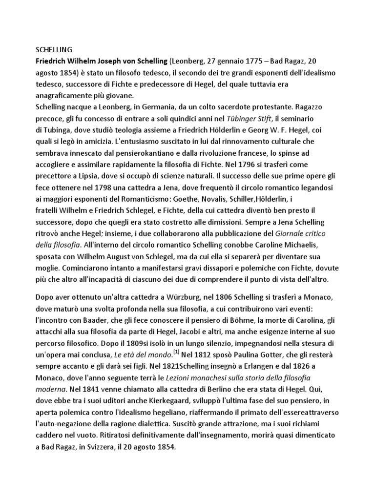 fo tedesco, il secondo dei tre grandi esponenti dell'idealismo tedesco, successore di Fichte e predecessore di Hegel, del quale tuttavia era anagraficamente pi giovane. Schelling nacque a Leonberg, in Germania, da un colto sacerdote protestante. Ragazzo precoce, gli fu concesso di entrare a soli quindici anni nel Tbinger Stift, il seminario di Tubinga, dove studi teologia assieme a Friedrich Hlderlin e Georg W. F. Hegel, coi quali si leg in amicizia. L'entusiasmo suscitato in lui dal rinnovamento culturale che sembrava innescato dal pensierokantiano e dalla rivoluzione francese, lo spinse ad accogliere e assimilare rapidamente la filosofia di Fichte. Nel 1796 si trasfer come precettore a Lipsia, dove si occup di scienze naturali. Il successo delle sue prime opere gli fece ottenere nel 1798 una cattedra a Jena, dove frequent il circolo romantico legandosi ai maggiori esponenti del Romanticismo: Goethe, Novalis, Schiller,Hlderlin, i fratelli Wilhelm e Friedrich Schlegel, e Fichte, della cui cattedra divent ben presto il successore, dopo che quegli era stato costretto alle dimissioni. Sempre a Jena Schelling ritrov anche Hegel; insieme, i due collaborarono alla pubblicazione del Giornale critico della filosofia. All'interno del circolo romantico Schelling conobbe Caroline Michaelis, sposata con Wilhelm August von Schlegel, ma da cui ella si separer per diventare sua moglie. Cominciarono intanto a manifestarsi gravi dissapori e polemiche con Fichte, dovute pi che altro all'incapacit di ciascuno dei due di comprendere il punto di vista dell'altro. Dopo aver ottenuto un'altra cattedra a Wrzburg, nel 1806 Schelling si trasfer a Monaco, dove matur una svolta profonda nella sua filosofia, a cui contribuirono vari eventi: l'incontro con Baader, che gli fece conoscere il pensiero di Bhme, la morte di Carolina, gli attacchi alla sua filosofia da parte di Hegel, Jacobi e altri, ma anche esigenze interne al suo percorso filosofico. Dopo il 1809si isol in un lungo silenzio, impegnandosi nella stesura di un'opera mai conclusa, Le et del mondo.[1] Nel 1812 spos Paulina Gotter, che gli rester sempre accanto e gli dar sei figli. Nel 1821Schelling insegn a Erlangen e dal 1826 a Monaco, dove l'anno seguente terr le Lezioni monachesi sulla storia della filosofia moderna. Nel 1841 venne chiamato alla cattedra di Berlino che era stata di Hegel. Qui, dove ebbe tra i suoi uditori anche Kierkegaard, svilupp l'ultima fase del suo pensiero, in aperta polemica contro l'idealismo hegeliano, riaffermando il primato dell'essereattraverso l'auto-negazione della ragione dialettica. Suscit grande attrazione, ma i suoi richiami caddero nel vuoto. Ritiratosi definitivamente dall'insegnamento, morir quasi dimenticato a Bad Ragaz, in Svizzera, il 20 agosto 1854.