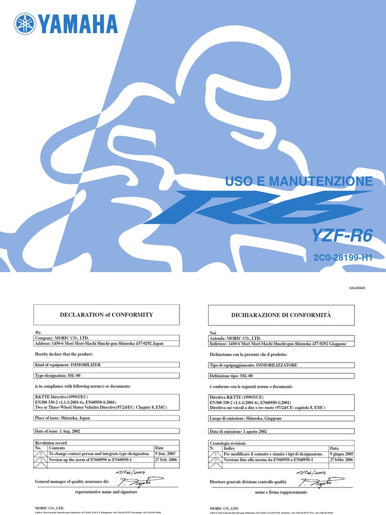 Benvenuti nel mondo delle moto Yamaha! Con lacquisto del YZF-R6, potrete avvalervi della vasta esperienza Yamaha e delle tecnologie pi avanzate profuse nella progettazione e nella costruzione di prodotti di alto livello qualitativo che hanno valso alla Yamaha la sua reputazione di assoluta affidabilit. Leggete questo manuale senza fretta e da cima a fondo. Potrete godervi tutti i vantaggi che la vostra YZF-R6 offre. Il libretto di uso e manutenzione non fornisce solo istruzioni sul funzionamento, la verifica e la manutenzione del vostro motociclo, ma indica anche come salvaguardare s stessi e gli altri evitando problemi e rischio di lesioni. Inoltre i numerosi consigli contenuti in questo libretto aiutano a mantenere il motociclo nelle migliori condizioni possibili. Se una volta letto il manuale, avesse ulteriori quesiti da porre, si rivolga liberamente al Suo concessionario Yamaha. Il team della Yamaha vi augura una lunga guida sicura e piacevole. Ricordi sempre di anteporre la sicurezza ad ogni altra cosa.
