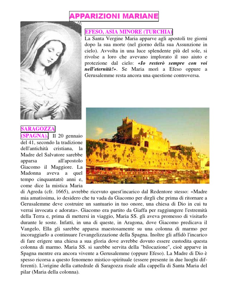Dal 1963 si manifestarono alcune appari- zioni di Maria [Link] un convento alla periferia cittadina. In queste apparizioni la Madonna invi anche un messaggio di pace: La volont di Dio quella di donare la pace, ma solo se viene praticata la preghiera e l'amore per il prossimo. CONCHAR, GRANADA (SPAGNA). Maria SS. apparve pi volte a una donna di quarantacinque anni, Dolores O.D. Il 17 ottobre apparve a Dolores in una veste marrone con il Bambino Ges ricoperto di piaghe e le spieg che i peccati dell'umanit avevano ferito Ges. FRIBURGO (SVIZZERA). La Madonna apparve a una veggente sconosciuta con il titolo di Regina dell'universo. Le affid diversi messaggi per l'umanit e l'esort alla recita quotidiana del santo Rosario, inoltre predisse avvenimenti futuri. La veggente ricevette anche due apparizioni mariane a Lourdes e poi ancora altre fino al l gennaio 1968. Nell'anno 1973 (3 ottobre e 24 novembre) la veggente ebbe il privilegio di ricevere alcune apparizioni di Ges Cristo. LOTTICH (BELGIO). Una donna, chiamata Margherita, ricevette per alcuni anni messaggi della Madonna e di Ges Cristo che verranno raccolti nel libro Il Messaggio dell'Amore misericordioso alle piccole anime. Conseguentemente alle manifestazioni soprannaturali sar fondata la Legione delle piccole anime con sede a Chvremont. PARIGI (FRANCIA). La Santa Vergine Maria apparve insieme a Ges a Parigi, consecutivamente per nove anni, a una persona giovane rimasta sconosciuta e le diede messaggi dal contenuto insolito. Si mostr vestita di bianco su una nuvola con un cuore pieno di strali luminosi. Si rivel come Madre del Salvatore oppure Madre della verit. Nel 1974 la veggente lasci Parigi ed entr in un Ordine religioso. AYN EL DELB (LIBANO). Maria SS. apparve alla ragazza quattordicenne Wardi Mansoer il 31 marzo 1966 e poi ancora altre volte, per affidarle messaggi profetici. PORTO SANTO STEFANO (TOSCANA). I fatti soprannaturali legati alle apparizioni mariane di Porto Santo Stefano ebbero una grande risonanza in Italia e all'estero. Il protagonista principale dell'episodio mariano fu Enzo Alocci, un agricoltore di trentacinque anni che viveva con la sua numerosa famiglia in questa cittadina della Toscana. Enzo non si distingueva particolarmente per la devozione religiosa, ma un giorno quando un quadro di Maria venne offeso da un collega di lavoro, istintivamente, lo salv dalla pattumiera, lo pul e se lo port a casa. Il quadro mostra la Santa Vergine Maria seduta sul trono della gloria, mentre con la destra impugna uno scettro, con la sinistra la sfera terrestre con la croce e due angeli sorreggono la sua