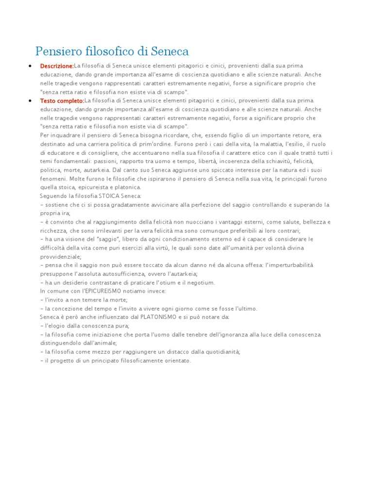 Testo completo:La filosofia di Seneca unisce elementi pitagorici e cinici, provenienti dalla sua prima educazione, dando grande importanza all'esame di coscienza quotidiano e alle scienze naturali. Anche nelle tragedie vengono rappresentati caratteri estremamente negativi, forse a significare proprio che "senza retta ratio e filosofia non esiste via di scampo". Per inquadrare il pensiero di Seneca bisogna ricordare, che, essendo figlio di un importante retore, era destinato ad una carriera politica di prim'ordine. Furono per i casi della vita, la malattia, l'esilio, il ruolo di educatore e di consigliere, che accentuarono nella sua filosofia il carattere etico con il quale tratt tutti i temi fondamentali: passioni, rapporto tra uomo e tempo, libert, incoerenza della schiavit, felicit, politica, morte, autarkeia. Dal canto suo Seneca aggiunse uno spiccato interesse per la natura ed i suoi fenomeni. Molte furono le filosofie che ispirarono il pensiero di Seneca nella sua vita, le principali furono quella stoica, epicureista e platonica. Seguendo la filosofia STOICA Seneca: - sostiene che ci si possa gradatamente avvicinare alla perfezione del saggio controllando e superando la propria ira; - convinto che al raggiungimento della felicit non nuocciano i vantaggi esterni, come salute, bellezza e ricchezza, che sono irrilevanti per la vera felicit ma sono comunque preferibili ai loro contrari; - ha una visione del saggio, libero da ogni condizionamento esterno ed capace di considerare le difficolt della vita come puri esercizi alla virt, le quali sono date allumanit per volont divina provvidenziale; - pensa che il saggio non pu essere toccato da alcun danno n da alcuna offesa: limperturbabilit presuppone lassoluta autosufficienza, ovvero l'autarkeia; - ha un desiderio contrastane di praticare lotium e il negotium. In comune con l'EPICUREISMO notiamo invece: - l'invito a non temere la morte; - la concezione del tempo e l'invito a vivere ogni giorno come se fosse l'ultimo. Seneca per anche influenzato dal PLATONISMO e si pu notare da: - l'elogio dalla conoscenza pura; - la filosofia come iniziazione che porta l'uomo dalle tenebre dell'ignoranza alla luce della conoscenza distinguendolo dall'animale; - la filosofia come mezzo per raggiungere un distacco dalla quotidianit; - il progetto di un principato filosoficamente orientato.