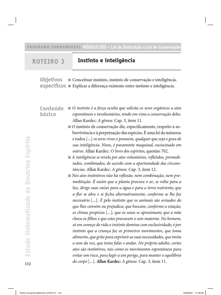 19. ______. Tema: A gerao espontnea e a gnese, ano dcimo primeiro, 1868. N7, ms de julho. 20. FLAMMARION, Camille. Deus na natureza. Traduo de Manuel Justiniano Quinto. 5. ed. Rio de Janeiro: FEB, 1987. Tomo IV, cap. 2 (Plano da natureza. Instinto e inteligncia), p. 351-352. 21. XAVIER, Francisco Cndido. Entre a terra e o cu. Pelo Esprito Andr Luiz. 21. ed. Rio de Janeiro: FEB, 2003. Cap. 21 (Conversao edificante), p. 172. 22. ______. No mundo maior. Pelo Esprito Andr Luiz. 1 edio especial, Rio de Janeiro: FEB, 2003. Cap. 4 (Estudando o crebro), p. 58-59. 23. ______. O consolador. Pelo Esprito Emmanuel. 24. ed. Rio de Janeiro: FEB, 2003, questo 117, p. 78.