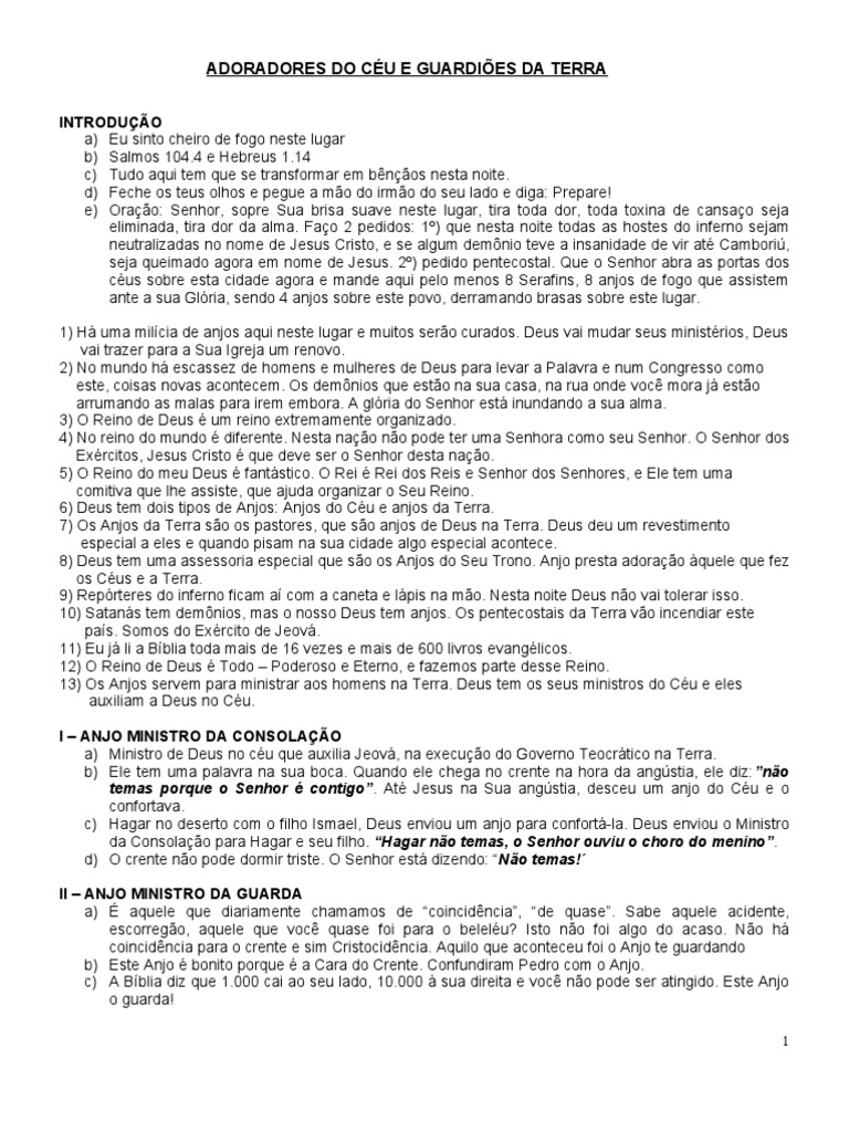 INTRODUO a) Eu sinto cheiro de fogo neste lugar b) Salmos 104.4 e Hebreus 1.14 c) Tudo aqui tem que se transformar em bnos nesta noite. d) Feche os teus olhos e pegue a mo do irmo do seu lado e diga: Prepare! e) Orao: Senhor, sopre Sua brisa suave neste lugar, tira toda dor, toda toxina de cansao seja eliminada, tira dor da alma. Fao 2 pedidos: 1) que nesta noite todas as hostes do inferno sejam neutralizadas no nome de Jesus Cristo, e se algum demnio teve a insanidade de vir at Cambori, seja queimado agora em nome de Jesus. 2) pedido pentecostal. Que o Senhor abra as portas dos cus sobre esta cidade agora e mande aqui pelo menos 8 Serafins, 8 anjos de fogo que assistem ante a sua Glria, sendo 4 anjos sobre este povo, derramando brasas sobre este lugar. 1) H uma milcia de anjos aqui neste lugar e muitos sero curados. Deus vai mudar seus ministrios, Deus vai trazer para a Sua Igreja um renovo. 2) No mundo h escassez de homens e mulheres de Deus para levar a Palavra e num Congresso como este, coisas novas acontecem. Os demnios que esto na sua casa, na rua onde voc mora j esto arrumando as malas para irem embora. A glria do Senhor est inundando a sua alma. 3) O Reino de Deus um reino extremamente organizado. 4) No reino do mundo diferente. Nesta nao no pode ter uma Senhora como seu Senhor. O Senhor dos Exrcitos, Jesus Cristo que deve ser o Senhor desta nao. 5) O Reino do meu Deus fantstico. O Rei Rei dos Reis e Senhor dos Senhores, e Ele tem uma comitiva que lhe assiste, que ajuda organizar o Seu Reino. 6) Deus tem dois tipos de Anjos: Anjos do Cu e anjos da Terra. 7) Os Anjos da Terra so os pastores, que so anjos de Deus na Terra. Deus deu um revestimento especial a eles e quando pisam na sua cidade algo especial acontece. 8) Deus tem uma assessoria especial que so os Anjos do Seu Trono. Anjo presta adorao quele que fez os Cus e a Terra. 9) Reprteres do inferno ficam a com a caneta e lpis na mo. Nesta noite Deus no vai tolerar isso. 10) Satans tem demnios, mas o nosso Deus tem anjos. Os pentecostais da Terra vo incendiar este pas. Somos do Exrcito de Jeov. 11) Eu j li a Bblia toda mais de 16 vezes e mais de 600 livros evanglicos. 12) O Reino de Deus Todo Poderoso e Eterno, e fazemos parte desse Reino. 13) Os Anjos servem para ministrar aos homens na Terra. Deus tem os seus ministros do Cu e eles auxiliam a Deus no Cu. I ANJO MINISTRO DA CONSOLAO a) Ministro de Deus no cu que auxilia Jeov, na execuo do Governo Teocrtico na Terra. b) Ele tem uma palavra na sua boca. Quando ele chega no crente na hora da angstia, ele diz: no temas porque o Senhor contigo . At Jesus na Sua angstia, desceu um anjo do Cu e o confortava. c) Hagar no deserto com o filho Ismael, Deus enviou um anjo para confort-la. Deus enviou o Ministro da Consolao para Hagar e seu filho. Hagar no temas, o Senhor ouviu o choro do menino. d) O crente no pode dormir triste. O Senhor est dizendo: No temas! II ANJO MINISTRO DA GUARDA a) aquele que diariamente chamamos de coincidncia, de quase. Sabe aquele acidente, escorrego, aquele que voc quase foi para o belelu? Isto no foi algo do acaso. No h coincidncia para o crente e sim Cristocidncia. Aquilo que aconteceu foi o Anjo te guardando b) Este Anjo bonito porque a Cara do Crente. Confundiram Pedro com o Anjo. c) A Bblia diz que 1.000 cai ao seu lado, 10.000 sua direita e voc no pode ser atingido. Este Anjo o guarda!