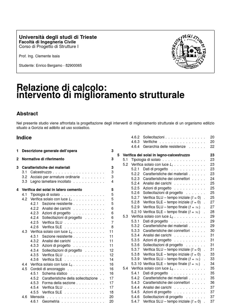 1 Descrizione generale dellopera 2 Normative di riferimento 3 Caratteristiche dei materiali 3.1 Calcestruzzo . . . . . . . . . . . . . . . . . . 3.2 Acciaio per armature ordinarie . . . . . . . . 3.3 Legno lamellare incollato . . . . . . . . . . . 4 Verica dei solai in latero cemento 4.1 Tipologia di solaio . . . . . . . . . . . . . 4.2 Verica solaio con luce L1 . . . . . . . . . 4.2.1 Sezione resistente . . . . . . . . . 4.2.2 Analisi dei carichi . . . . . . . . . 4.2.3 Azioni di progetto . . . . . . . . . 4.2.4 Sollecitazioni di progetto . . . . . 4.2.5 Verica SLU . . . . . . . . . . . . 4.2.6 Verica SLE . . . . . . . . . . . . 4.3 Verica solaio con luce L2 . . . . . . . . . 4.3.1 Sezione resistente . . . . . . . . . 4.3.2 Analisi dei carichi . . . . . . . . . 4.3.3 Azioni di progetto . . . . . . . . . 4.3.4 Sollecitazioni di progetto . . . . . 4.3.5 Verica SLU . . . . . . . . . . . . 4.3.6 Verica SLE . . . . . . . . . . . . 4.4 Verica solaio con luce L3 . . . . . . . . . 4.5 Cordoli di ancoraggio . . . . . . . . . . . 4.5.1 Schema statico . . . . . . . . . . 4.5.2 Caratteristiche della sollecitazione 4.5.3 Forma della sezione . . . . . . . . 4.5.4 Verica SLU . . . . . . . . . . . . 4.5.5 Verica SLE . . . . . . . . . . . . 4.6 Mensola . . . . . . . . . . . . . . . . . . 4.6.1 Geometria . . . . . . . . . . . . . . . . . . . . . . . . . . . . . . . . . . . . . . . . . . . . . . . . . . . . . . . . . . . . . 3 3 3 3 3 4 5 5 5 5 6 6 6 7 8 11 11 11 11 12 12 14 16 16 16 17 17 17 18 20 20