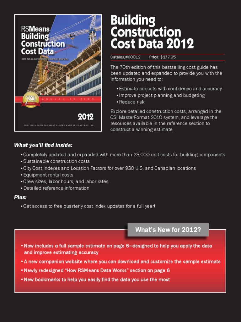 The 70th edition of this bestselling cost guide has been updated and expanded to provide you with the information you need to: Estimate projects with confidence and accuracy Improve project planning and budgeting Reduce risk Explore detailed construction costs, arranged in the CSI MasterFormat 2010 system, and leverage the resources available in the reference section to construct a winning estimate.