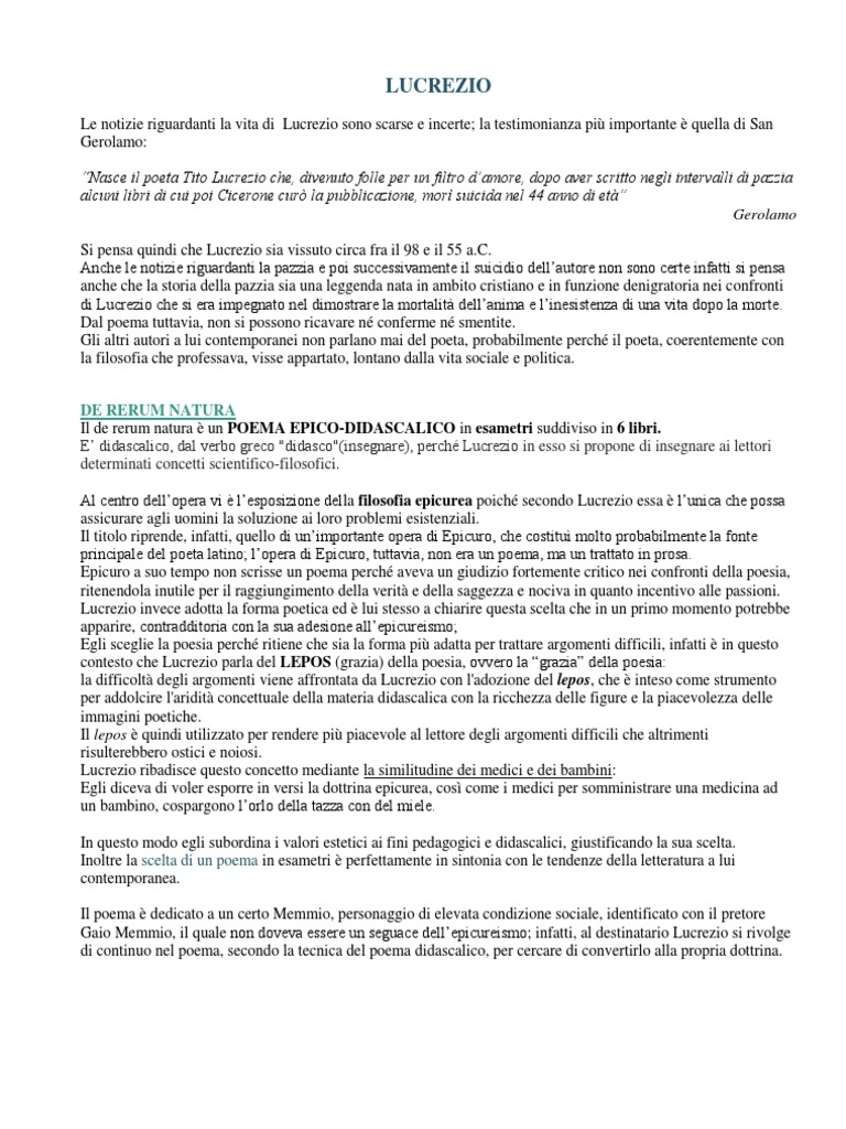 Le notizie riguardanti la vita di Lucrezio sono scarse e incerte; la testimonianza pi importante quella di San Gerolamo: Nasce il poeta Tito Lucrezio che, divenuto folle per un filtro damore, dopo aver scritto negli intervalli di pazzia alcuni libri di cui poi Cicerone cur la pubblicazione, mor suicida nel 44 anno di et Gerolamo Si pensa quindi che Lucrezio sia vissuto circa fra il 98 e il 55 a.C. Anche le notizie riguardanti la pazzia e poi successivamente il suicidio dellautore non sono certe infatti si pensa anche che la storia della pazzia sia una leggenda nata in ambito cristiano e in funzione denigratoria nei confronti di Lucrezio che si era impegnato nel dimostrare la mortalit dellanima e linesistenza di una vita dopo la morte. Dal poema tuttavia, non si possono ricavare n conferme n smentite. Gli altri autori a lui contemporanei non parlano mai del poeta, probabilmente perch il poeta, coerentemente con la filosofia che professava, visse appartato, lontano dalla vita sociale e politica. DE RERUM NATURA Il de rerum natura un POEMA EPICO-DIDASCALICO in esametri suddiviso in 6 libri. E didascalico, dal verbo greco "didasco"(insegnare), perch Lucrezio in esso si propone di insegnare ai lettori determinati concetti scientifico-filosofici. Al centro dellopera vi lesposizione della filosofia epicurea poich secondo Lucrezio essa lunica che possa assicurare agli uomini la soluzione ai loro problemi esistenziali. Il titolo riprende, infatti, quello di unimportante opera di Epicuro, che costitu molto probabilmente la fonte principale del poeta latino; lopera di Epicuro, tuttavia, non era un poema, ma un trattato in prosa. Epicuro a suo tempo non scrisse un poema perch aveva un giudizio fortemente critico nei confronti della poesia, ritenendola inutile per il raggiungimento della verit e della saggezza e nociva in quanto incentivo alle passioni. Lucrezio invece adotta la forma poetica ed lui stesso a chiarire questa scelta che in un primo momento potrebbe apparire, contradditoria con la sua adesione allepicureismo; Egli sceglie la poesia perch ritiene che sia la forma pi adatta per trattare argomenti difficili, infatti in questo contesto che Lucrezio parla del LEPOS (grazia) della poesia, ovvero la grazia della poesia: la difficolt degli argomenti viene affrontata da Lucrezio con l'adozione del lepos, che inteso come strumento per addolcire l'aridit concettuale della materia didascalica con la ricchezza delle figure e la piacevolezza delle immagini poetiche. Il lepos quindi utilizzato per rendere pi piacevole al lettore degli argomenti difficili che altrimenti risulterebbero ostici e noiosi. Lucrezio ribadisce questo concetto mediante la similitudine dei medici e dei bambini: Egli diceva di voler esporre in versi la dottrina epicurea, cos come i medici per somministrare una medicina ad un bambino, cospargono lorlo della tazza con del miele. In questo modo egli subordina i valori estetici ai fini pedagogici e didascalici, giustificando la sua scelta. Inoltre la scelta di un poema in esametri perfettamente in sintonia con le tendenze della letteratura a lui contemporanea. Il poema dedicato a un certo Memmio, personaggio di elevata condizione sociale, identificato con il pretore Gaio Memmio, il quale non doveva essere un seguace dellepicureismo; infatti, al destinatario Lucrezio si rivolge di continuo nel poema, secondo la tecnica del poema didascalico, per cercare di convertirlo alla propria dottrina.