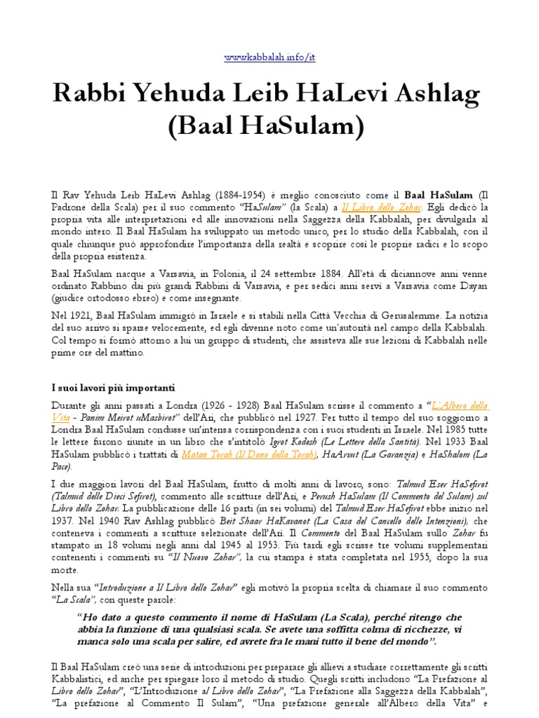 Il Rav Yehuda Leib HaLevi Ashlag (1884-1954) meglio conosciuto come il Baal HaSulam (Il Padrone della Scala) per il suo commento HaSulam (la Scala) a Il Libro dello Zohar. Egli dedic la propria vita alle interpretazioni ed alle innovazioni nella Saggezza della Kabbalah, per divulgarla al mondo intero. Il Baal HaSulam ha sviluppato un metodo unico, per lo studio della Kabbalah, con il quale chiunque pu approfondire limportanza della realt e scoprire cos le proprie radici e lo scopo della propria esistenza. Baal HaSulam nacque a Varsavia, in Polonia, il 24 settembre 1884. All'et di diciannove anni venne ordinato Rabbino dai pi grandi Rabbini di Varsavia, e per sedici anni serv a Varsavia come Dayan (giudice ortodosso ebreo) e come insegnante. Nel 1921, Baal HaSulam immigr in Israele e si stabil nella Citt Vecchia di Gerusalemme. La notizia del suo arrivo si sparse velocemente, ed egli divenne noto come un'autorit nel campo della Kabbalah. Col tempo si form attorno a lui un gruppo di studenti, che assisteva alle sue lezioni di Kabbalah nelle prime ore del mattino. I suoi lavori pi importanti Durante gli anni passati a Londra (1926 - 1928) Baal HaSulam scrisse il commento a L'Albero della Vita - Panim Meirot uMasbirot dellAri, che pubblic nel 1927. Per tutto il tempo del suo soggiorno a Londra Baal HaSulam condusse unintensa corrispondenza con i suoi studenti in Israele. Nel 1985 tutte le lettere furono riunite in un libro che sintitol Igrot Kodesh (Le Lettere della Santit). Nel 1933 Baal HaSulam pubblic i trattati di Matan Torah (Il Dono della Torah), HaArvut (La Garanzia) e HaShalom (La Pace). I due maggiori lavori del Baal HaSulam, frutto di molti anni di lavoro, sono: Talmud Eser HaSefirot (Talmud delle Dieci Sefirot), commento alle scritture dellAr, e Perush HaSulam (Il Commento del Sulam) sul Libro dello Zohar. La pubblicazione delle 16 parti (in sei volumi) del Talmud Eser HaSefirot ebbe inizio nel 1937. Nel 1940 Rav Ashlag pubblic Beit Shaar HaKavanot (La Casa del Cancello delle Intenzioni), che conteneva i commenti a scritture selezionate dellAr. Il Commento del Baal HaSulam sullo Zohar fu stampato in 18 volumi negli anni dal 1945 al 1953. Pi tardi egli scrisse tre volumi supplementari contenenti i commenti su Il Nuovo Zohar, la cui stampa stata completata nel 1955, dopo la sua morte. Nella sua Introduzione a Il Libro dello Zohar egli motiv la propria scelta di chiamare il suo commento La Scala, con queste parole: Ho dato a questo commento il nome di HaSulam (La Scala), perch ritengo che abbia la funzione di una qualsiasi scala. Se avete una soffitta colma di ricchezze, vi manca solo una scala per salire, ed avrete fra le mani tutto il bene del mondo. Il Baal HaSulam cre una serie di introduzioni per preparare gli allievi a studiare correttamente gli scritti Kabbalistici, ed anche per spiegare loro il metodo di studio. Quegli scritti includono La Prefazione al Libro dello Zohar, LIntroduzione al Libro dello Zohar, La Prefazione alla Saggezza della Kabbalah, La prefazione al Commento Il Sulam, Una prefazione generale allAlbero della Vita e