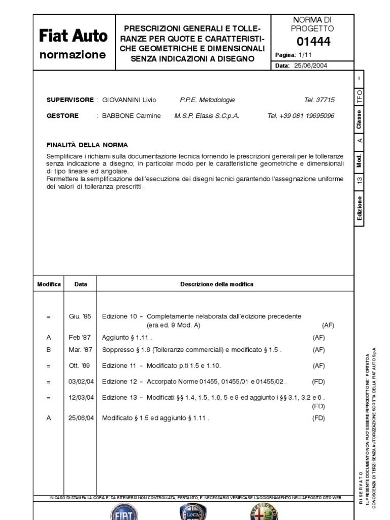 PRESCRIZIONI E RIFERIMENTI 1.1 Dimensioni Salvo diversamente specificato tutte le dimensioni sono in mm . 1.2 Simboli Norma 01366/01 1.3 Rugosit delle superfici Norma 01370 1.4 Tolleranza di forme Norme 01376 e 01377 1.5 Errori dimensionali e di forma massimi ammissibili per quote senza indicazione a disegno -per particolari vari: S vedere Norma 01460 (per documentazione emessa prima del 01/03/1983) S vedere 3 (per documentazione emessa dopo il 01/03/1983) per bulloneria : Norme 01481, 01380, 01390 e 01307 per elementi di carrozzeria : Norma 00237 per superfici e bordi di porte, cofani e sportelli, da assemblarsi con flangiatura nelle aree di accoppiamento : Norma 00237 per forma e dimensioni alette per giunzioni elementi di carrozzeria ottenute con piegatura a slitta: Norma 00216 per forma e dimensioni alette per giunzioni elementi di carrozzeria ottenute mediante tranciatura o rifilatura : Norma 00217 per tolleranze elementi singoli stampati in lamiera : Norma 00237 per tolleranza sulle luci nominali e sui profili negli accoppiamenti mobili di carrozzeria: Norme 80035, 80084 e 80087 per tolleranze dimensionali e di forma sui vani sede parabrezza, lunotto, cristalli laterali fissi: Norma 80039 per fori e superfici su carrozzeria per riferimenti primari e complementari : Norma 00285 per fori ed asole di carrozzeria-- Norma 01328 per tolleranze dimensionali su elementi di carrozzeria, in termini di profili di superficie, profili di contorni e profili correlati : Norma 00223