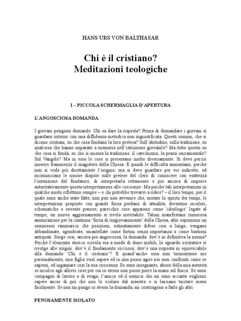 attingere da s. E poich la fonte pi profonda, pi inesauribile ed anche quella a cui pi si attinge, Cristo ed il cristiano credente ha per modello questo prototipo, non esiste alcun motivo di mettere in contrasto la propria dedizione di cristiani con quella di membri dellumanit. Il disinteresse, lessere a disposizione implica in entrambi i campi che luomo abbia qualcosa da dare, che sia valente e competente nel campo mondano, e conseguentemente apporti per il campo della sua missione linteresse risoluto che di aiuto a questa valentia, che trovi piacere nella sua professione, sia essa importante come quella del ricercatore intellettuale, od insignificante come nel lavoro meccanico in fabbrica, che forse potrebbe anche essere assunto e sbrigato pi velocemente da una macchina. In quanto e finch in servizio, esso esige lesecuzione accurata che pu essere richiesta da un operaio coscienzioso. Il servo della parabola fedele nel poco e come ricompensa riceve potere su molto. La maggioranza degli uomini non pu compiere il proprio servizio vitale se non come minuscola parte in una gigantesca macchina prefabbricata, in cui facile sostituire i perni che si rompono con altri che girano altrettanto velocemente. E tuttavia ogni servo un uomo unico nel suo genere, e lamore del suo cuore insostituibile. Egli porta il suo amore personale nella grande massa anonima, e questo suo darsi, quando diviene cosciente di s, quasi una morte. Una morte sacrificale. Non si pu trovare a ridire al povero di conservare inoltre il suo posticino per la gioia e la ricreazione, neppure di nutrire la speranza e quasi la certezza che tutto il mondo si muova verso un futuro significativo, e la piccola onda che egli stata, sommersa a lungo nella corrente senza nome, giunga a riposo in un qualche mare sterminato. Anzi, luomo mondano non pu sapere qualcosa daltro, a meno che non si obblighi a qualche ingenuo abbozzo per il futuro, e questo poco lo guidi ad interpretare ed a versare la sua vita come offerta [Link] qui il caso di domandarci se effettivamente egli compie questa dedizione; ha importanza decisiva il fatto che essa pu essere prestata dal cristiano nel campo del mondo, e che gi posta nella direzione oggettiva della vita, che ha fine, ma che in quanto spirito travalica la fine. Che quindi cavi fuori il massimo dalla sua esistenza luomo che, per un compito finito, che gli appare meritevole, la impegna nel modo pi radicale possibile. Senza dedizione allopera non c impegno totale, e viceversa. Non si pu quindi fare a meno dellazione nella dedizione estrema. Non ha ora importanza decisiva la parte che in questo impegno hanno lambizione, la forte volont di imporsi. C una buona ambizione di svolgere il proprio compito nel modo pi perfetto possibile: unambizione che si oggettiva per cos dire, nelle cose; e non soltanto dovere della moralit cristiana, ma gi di quella naturale, chiarirne i motivi in modo che una volont di azione soggettivamente progettata diventi realizzazione [Link] vuole ora obiettare che il cristiano non capace di questo impegno completo per le cose mondane, perch ha altrove testa e cuore (dov il tuo tesoro, ivi il tuo cuore): nella vita eterna futura? La vita terrena non sarebbe per lui che un luogo in cui di passaggio, in cui non vale la spesa attardarsi, guardarsi attorno e mettere su casa o addirittura rifinirla. Perci i cristiani sarebbero sempre distratti, mai veramente presenti, quando si tratta di costruire il futuro terreno. Per contro, da un punto di vista puramente empirico, si deve anzitutto chiedere chi mai abbia costruito la cultura occidentale, se non quasi esclusivamente i cristiani. Se non avessero avuto un senso dei valori mondani, come avrebbero potuto fabbricare simili recipienti simbolici al sopratemporale, alleterno? Ma anche in linea di principio, in base al vangelo, il servo amministratore non forse chiamato a non seppellire il suo talento, ma a farlo rendere? Cio, a ricavare dai pochi spiccioli dei suoi anni terreni la massima rendita? Non sa il cristiano, ancor pi di altri, quanto vale questunica vita