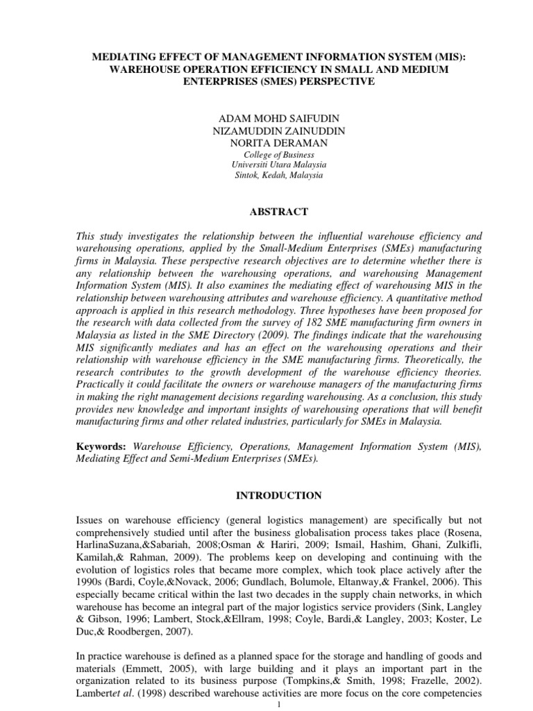 Keywords: Warehouse Efficiency, Operations, Management Information System (MIS), Mediating Effect and Semi-Medium Enterprises (SMEs).