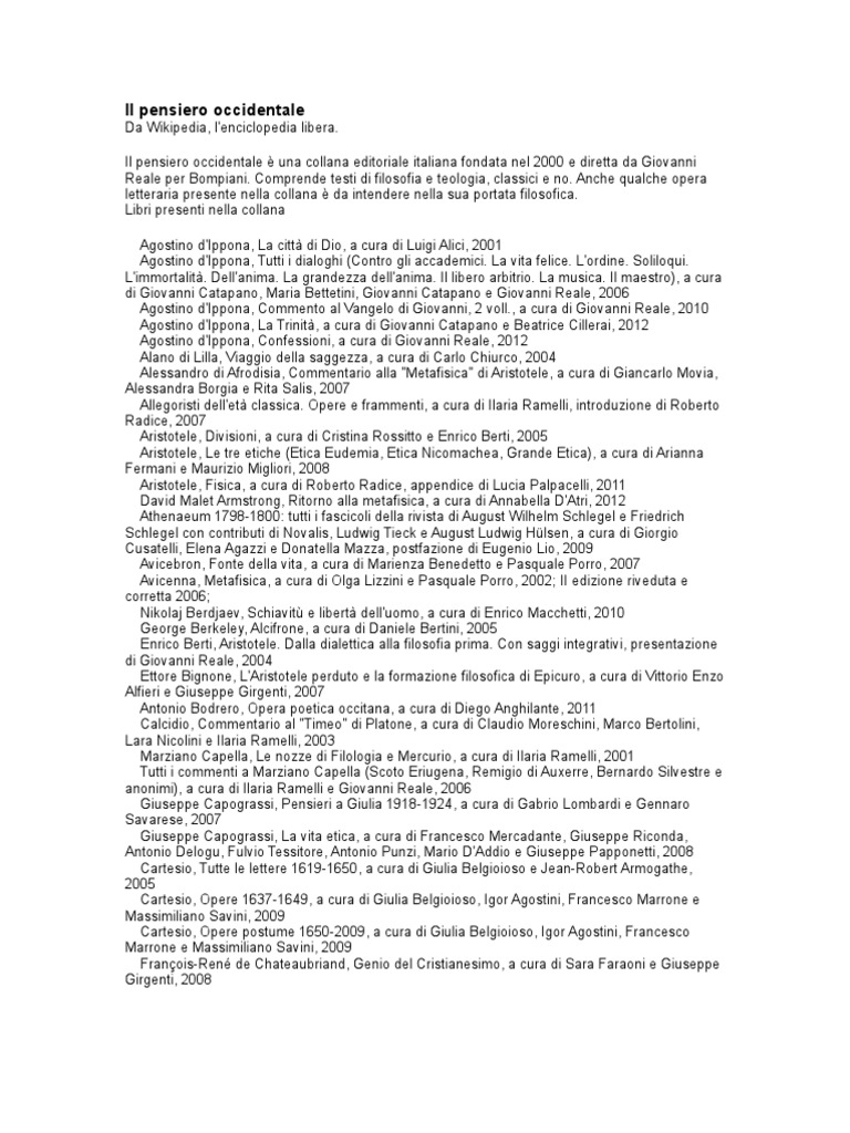 Da Wikipedia, l'enciclopedia libera. Il pensiero occidentale una collana editoriale italiana fondata nel 2000 e diretta da Giovanni Reale per Bompiani. Comprende testi di filosofia e teologia, classici e no. Anche qualche opera letteraria presente nella collana da intendere nella sua portata filosofica. Libri presenti nella collana Agostino d'Ippona, La citt di Dio, a cura di Luigi Alici, 2001 Agostino d'Ippona, Tutti i dialoghi (Contro gli accademici. La vita felice. L'ordine. Soliloqui. L'immortalit. Dell'anima. La grandezza dell'anima. Il libero arbitrio. La musica. Il maestro), a cura di Giovanni Catapano, Maria Bettetini, Giovanni Catapano e Giovanni Reale, 2006 Agostino d'Ippona, Commento al Vangelo di Giovanni, 2 voll., a cura di Giovanni Reale, 2010 Agostino d'Ippona, La Trinit, a cura di Giovanni Catapano e Beatrice Cillerai, 2012 Agostino d'Ippona, Confessioni, a cura di Giovanni Reale, 2012 Alano di Lilla, Viaggio della saggezza, a cura di Carlo Chiurco, 2004 Alessandro di Afrodisia, Commentario alla "Metafisica" di Aristotele, a cura di Giancarlo Movia, Alessandra Borgia e Rita Salis, 2007 Allegoristi dell'et classica. Opere e frammenti, a cura di Ilaria Ramelli, introduzione di Roberto Radice, 2007 Aristotele, Divisioni, a cura di Cristina Rossitto e Enrico Berti, 2005 Aristotele, Le tre etiche (Etica Eudemia, Etica Nicomachea, Grande Etica), a cura di Arianna Fermani e Maurizio Migliori, 2008 Aristotele, Fisica, a cura di Roberto Radice, appendice di Lucia Palpacelli, 2011 David Malet Armstrong, Ritorno alla metafisica, a cura di Annabella D'Atri, 2012 Athenaeum 1798-1800: tutti i fascicoli della rivista di August Wilhelm Schlegel e Friedrich Schlegel con contributi di Novalis, Ludwig Tieck e August Ludwig Hlsen, a cura di Giorgio Cusatelli, Elena Agazzi e Donatella Mazza, postfazione di Eugenio Lio, 2009 Avicebron, Fonte della vita, a cura di Marienza Benedetto e Pasquale Porro, 2007 Avicenna, Metafisica, a cura di Olga Lizzini e Pasquale Porro, 2002; II edizione riveduta e corretta 2006; Nikolaj Berdjaev, Schiavit e libert dell'uomo, a cura di Enrico Macchetti, 2010 George Berkeley, Alcifrone, a cura di Daniele Bertini, 2005 Enrico Berti, Aristotele. Dalla dialettica alla filosofia prima. Con saggi integrativi, presentazione di Giovanni Reale, 2004 Ettore Bignone, L'Aristotele perduto e la formazione filosofica di Epicuro, a cura di Vittorio Enzo Alfieri e Giuseppe Girgenti, 2007 Antonio Bodrero, Opera poetica occitana, a cura di Diego Anghilante, 2011 Calcidio, Commentario al "Timeo" di Platone, a cura di Claudio Moreschini, Marco Bertolini, Lara Nicolini e Ilaria Ramelli, 2003 Marziano Capella, Le nozze di Filologia e Mercurio, a cura di Ilaria Ramelli, 2001 Tutti i commenti a Marziano Capella (Scoto Eriugena, Remigio di Auxerre, Bernardo Silvestre e anonimi), a cura di Ilaria Ramelli e Giovanni Reale, 2006 Giuseppe Capograssi, Pensieri a Giulia 1918-1924, a cura di Gabrio Lombardi e Gennaro Savarese, 2007 Giuseppe Capograssi, La vita etica, a cura di Francesco Mercadante, Giuseppe Riconda, Antonio Delogu, Fulvio Tessitore, Antonio Punzi, Mario D'Addio e Giuseppe Papponetti, 2008 Cartesio, Tutte le lettere 1619-1650, a cura di Giulia Belgioioso e Jean-Robert Armogathe, 2005 Cartesio, Opere 1637-1649, a cura di Giulia Belgioioso, Igor Agostini, Francesco Marrone e Massimiliano Savini, 2009 Cartesio, Opere postume 1650-2009, a cura di Giulia Belgioioso, Igor Agostini, Francesco Marrone e Massimiliano Savini, 2009 Franois-Ren de Chateaubriand, Genio del Cristianesimo, a cura di Sara Faraoni e Giuseppe Girgenti, 2008