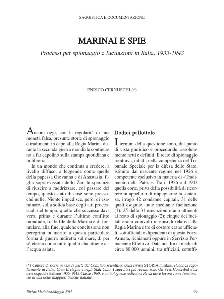 monegasca, anzi italiana da Brescia, tale Camilla Agliardi, afflitta apparentemente da parecchi quattrini, lo sventurato sottufficiale and incontro alla propria rovina passando al Deuxime Bureau transalpino alcuni lucidi di disegni relativi ai piani costruttivi di alcune unit in quel momento sullo scalo. Scoperto affront la condanna e lesecuzione, avvenuta a Forte Braschi, con grande dignit. La donna, condannata anchessa e definita, dopo la guerra, con una certa esagerazione, la Mata Hari italiana trascorse i successivi undici anni in prigione prima di essere sbrigativamente liberata dai Francesi grazie alla collaudata acquiescenza davanti a tutto del primo ministro Badoglio pochissimi giorni prima della di lui caduta e del correlato, definitivo allontanamento del Maresciallo dalla vita pubblica italiana (3). Segu, nellagosto 1938, la scoperta, a opera dei Carabinieri per la Marina e della Polizia, di una rete spionistica inglese formata in buona parte da elementi gi austriaci passati, dopo il 1919, nelle file della Regia Marina. Il maggiore imputato, degradato con infamia e fucilato subito dopo, il 6 marzo 1939, da un plotone di marinai al comando del tenente del CREM Antonio Langiu, fu, come ha ricordato lammiraglio De Courten nelle proprie memorie edite dallUfficio Storico della Marina Militare, il tenente di vascello Antonio Scarpa. Costui aveva fatto in precedenza, tra il 1915 e il 1918, per conto degli Italiani, lo stesso mestiere di spia fornendo al Reparto Informazioni della Regia Marina parecchie utili notizie da comandante di torpediniere dellImperial Regia Marina asburgica. Il flusso di informazioni, spesso molto tempestive, attinenti alle uscite, alle operazioni e agli sbarramenti in Alto Adriatico era stato anzi tale che a un certo punto la KuK Marine, avendo mangiato la foglia, aveva cerRivista Marittima-Maggio 2012