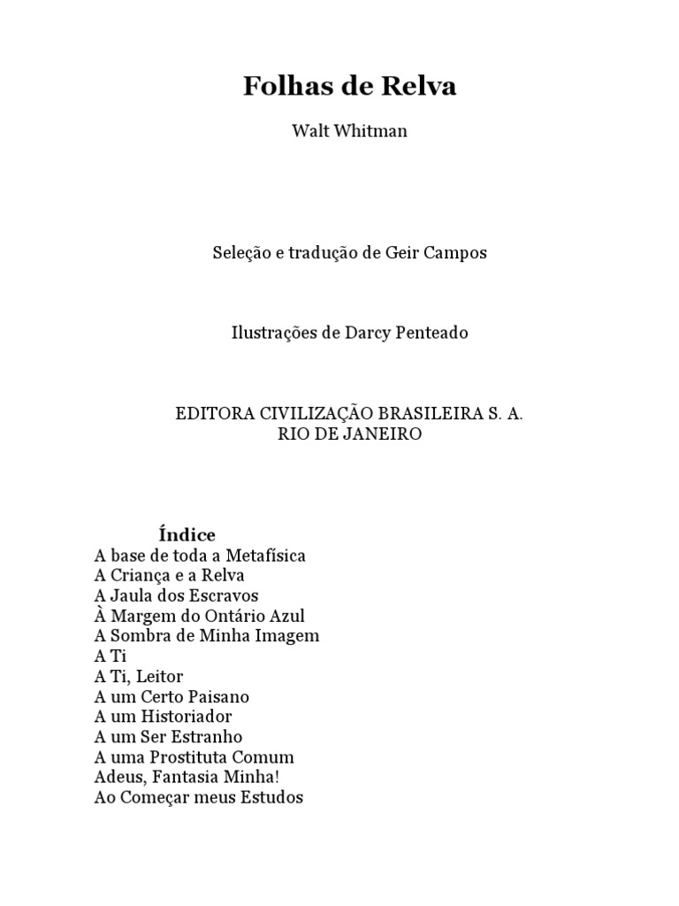 Bibliografia: Whitman, Walt. Leaves of Grass. New York: W. W. Norton & Company, 1973. Whitman, Walt. Folhas de Relva. Seleo e traduo de Geir Campos. Ilustraes de Darcy Penteado. Ed. Civilizao Brasileira. Rio de Janeiro, 1964.