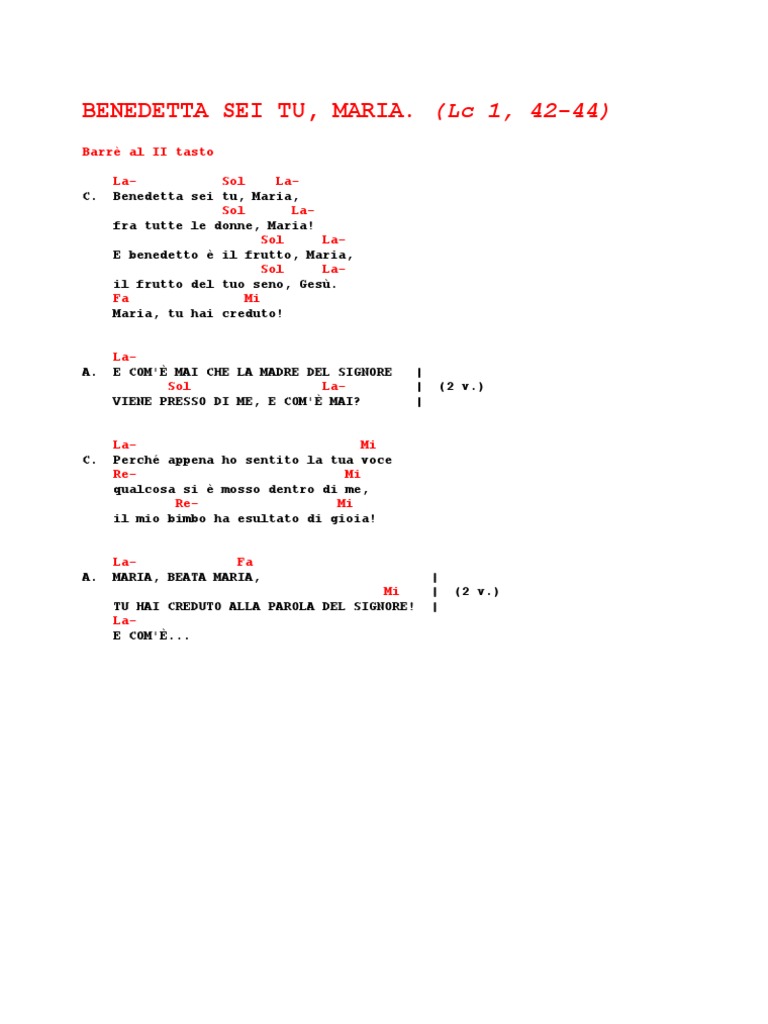 Barr al II tasto C. LaSol LaBenedetta sei tu, Maria, Sol Lafra tutte le donne, Maria! Sol LaE benedetto il frutto, Maria, Sol Lail frutto del tuo seno, Ges. Fa Mi Maria, tu hai creduto! LaE COM' MAI CHE LA MADRE DEL SIGNORE Sol LaVIENE PRESSO DI ME, E COM' MAI? LaMi Perch appena ho sentito la tua voce ReMi qualcosa si mosso dentro di me, ReMi il mio bimbo ha esultato di gioia! LaFa MARIA, BEATA MARIA, Mi TU HAI CREDUTO ALLA PAROLA DEL SIGNORE! LaE COM'...